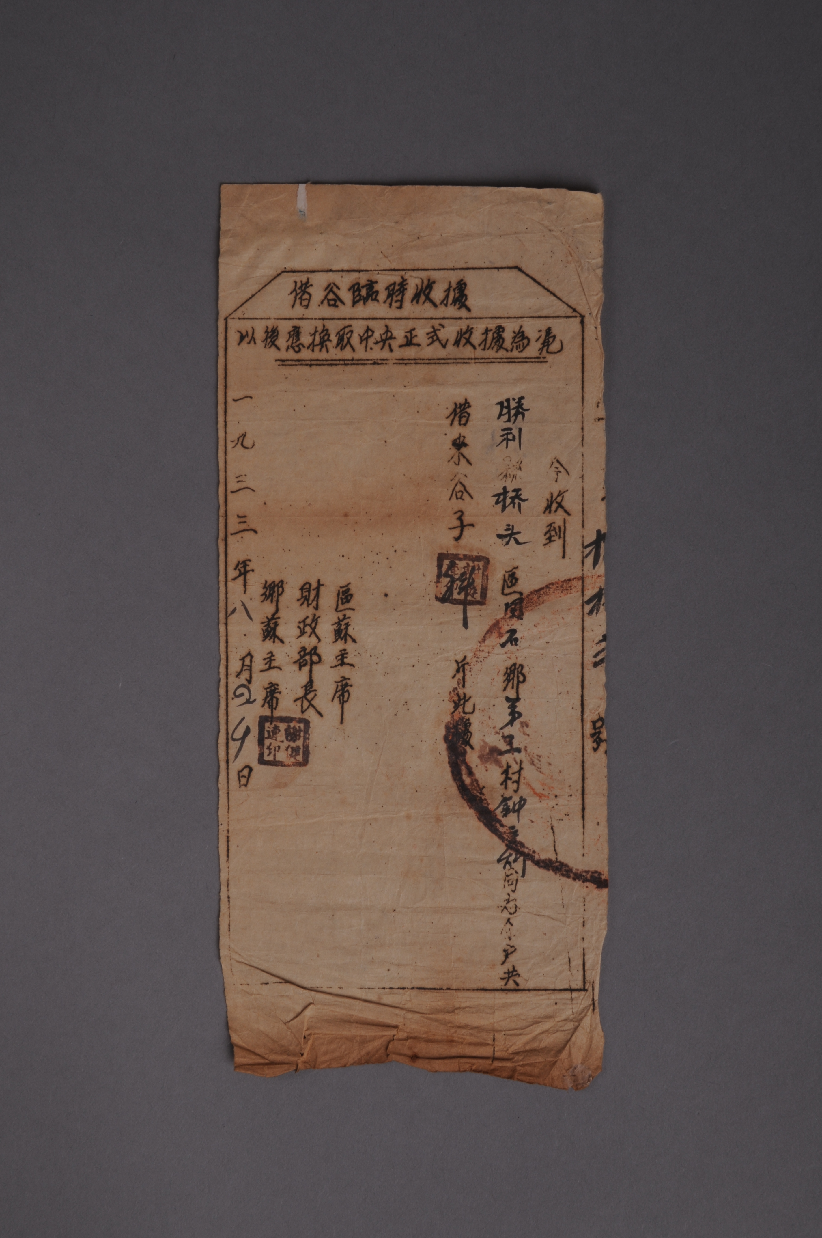 200408★1933年胜利县桥头区固石乡出具给钟立炘的借谷临时收据