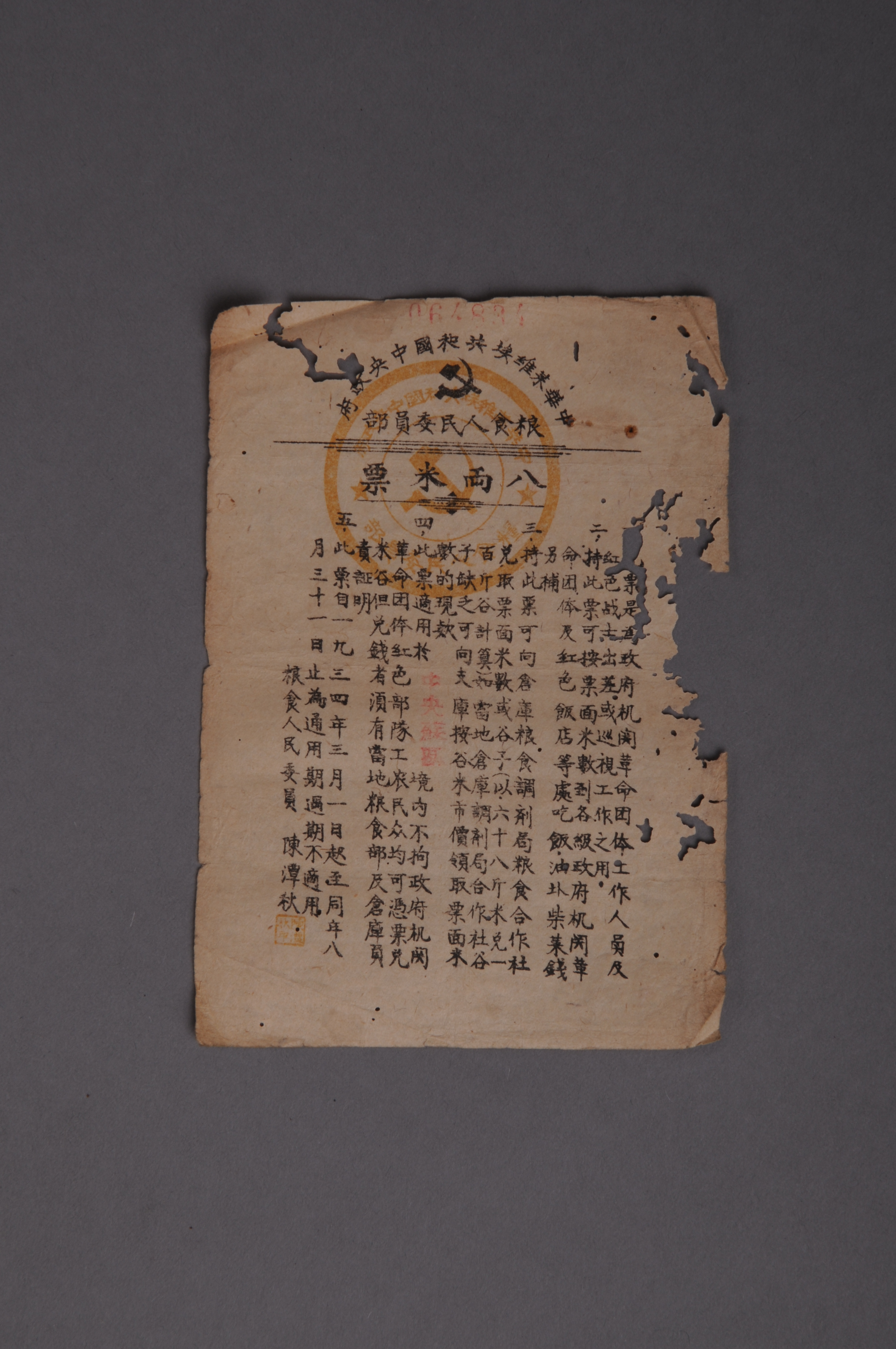 200936★1934年中华苏维埃共和国中央政府粮食人民委员部八两米票