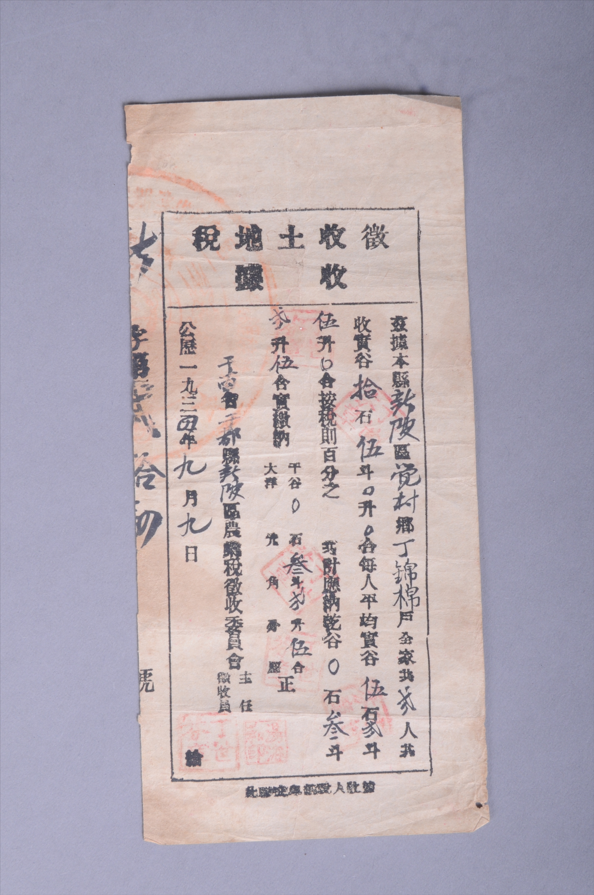 200529★1934年赣南省于都县新陂区农业税征收委员会发给丁锦棉征收土地税收据