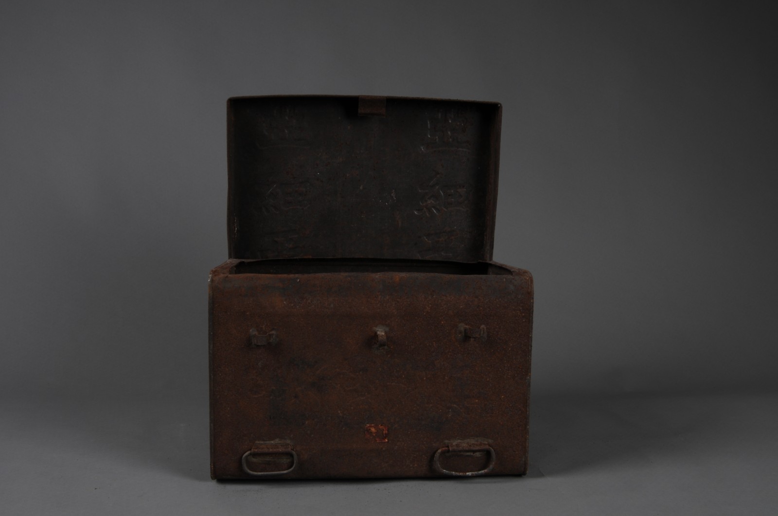 此公文箱系铁皮制成,长方形,有盖,正面铸有锁环,可以上锁,正面和背面下方均有对称铁环,这是1935年正月中央分局和中央政府办事处撤离于都黄麟井塘时留下的,一直保存在钟正予家中,1984年被征集入馆。