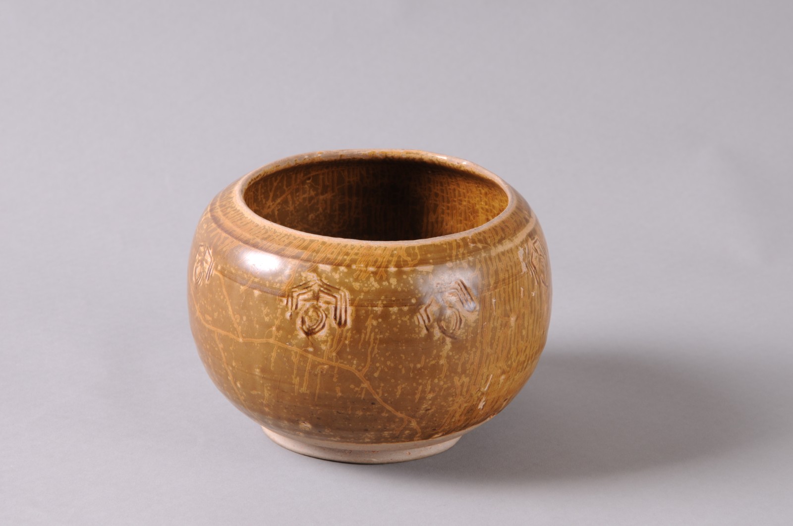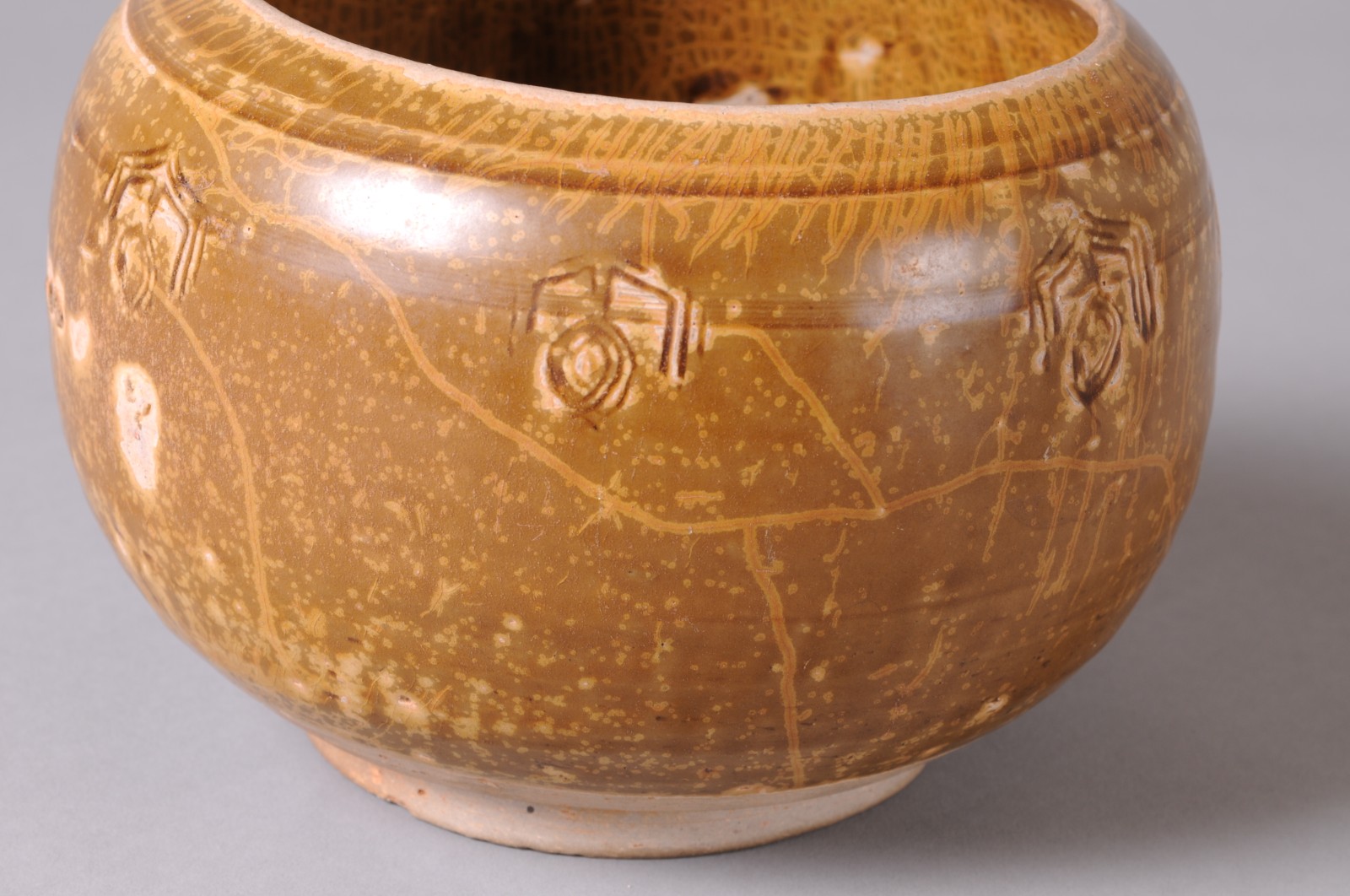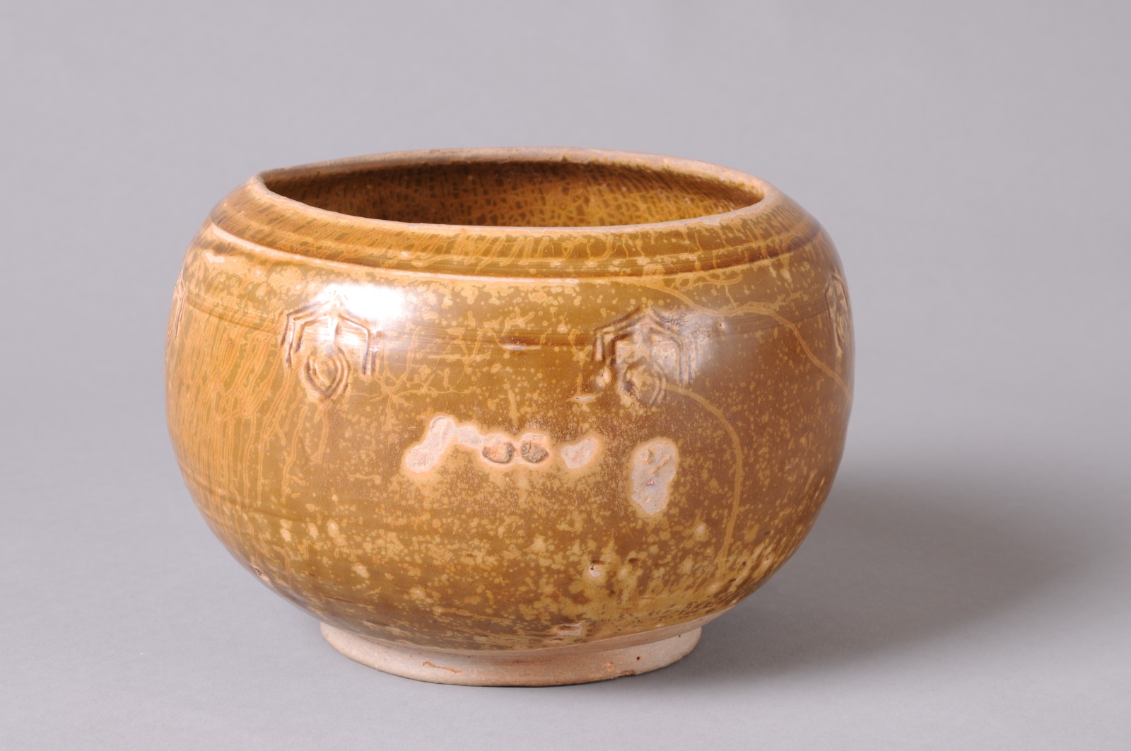圆唇,敛口,丰肩,鼓腹,饼形足微外撇。胎骨青灰,坚实。肩上饰二组带状弦纹,每组由五条排列紧密细弦纹构成。肩部一周刻七朵变体仰莲纹,三条阴线为花瓣外廓,三条同心阴线圈为花苞,刀法犀利自如,构图简洁。内外施半釉,施釉不匀,釉色青中闪蜜黄,釉层厚润,釉面开片呈鱼子纹。