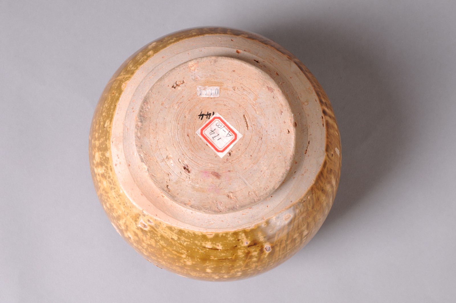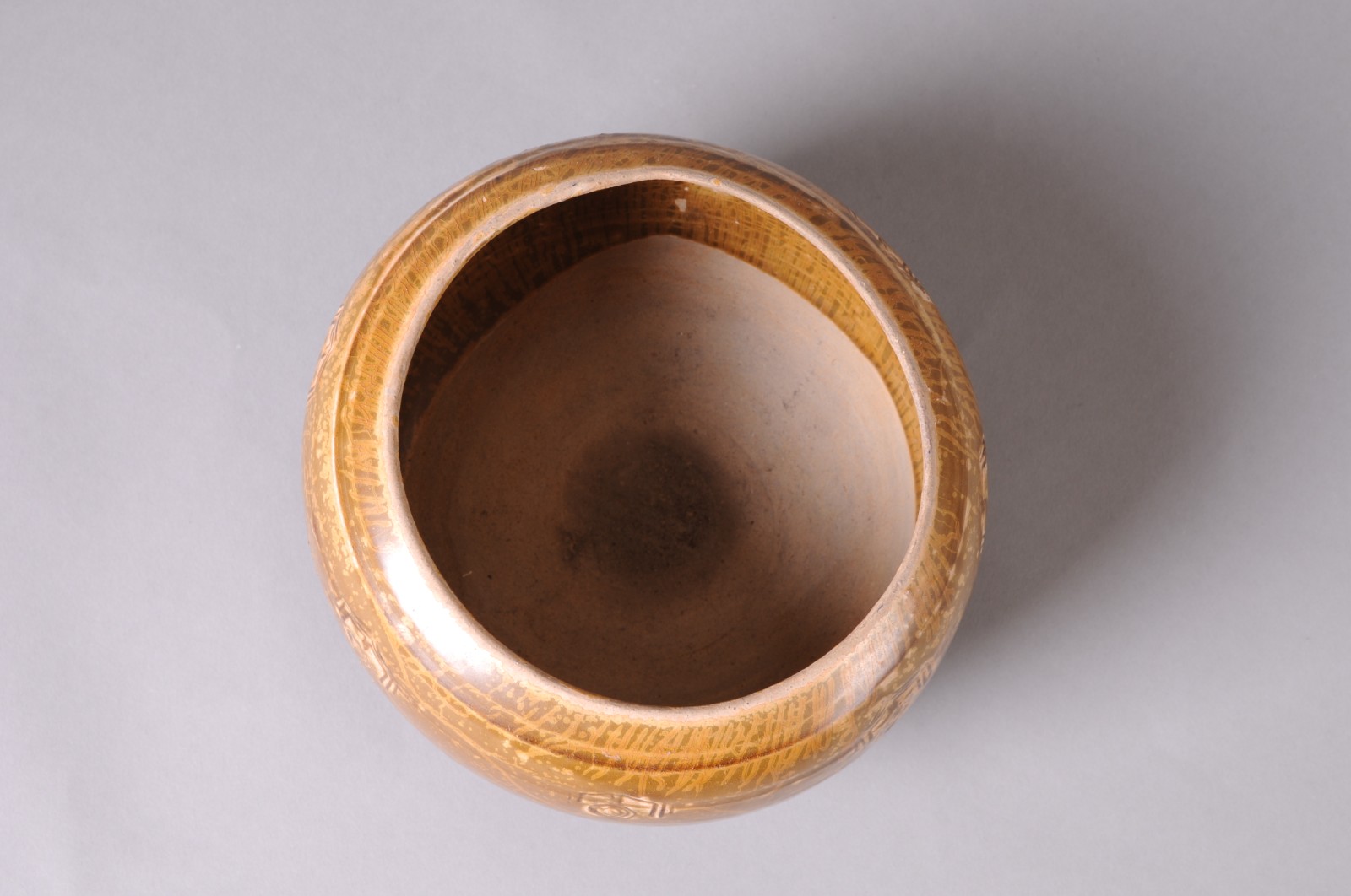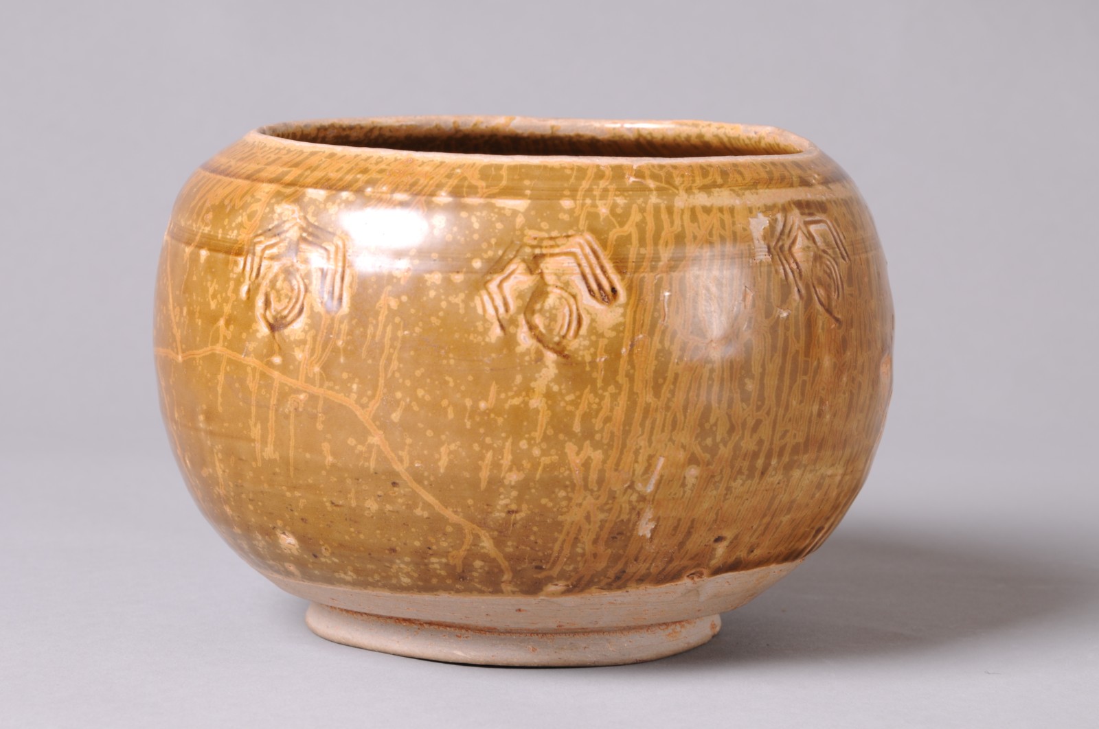 圆唇,敛口,丰肩,鼓腹,饼形足微外撇。胎骨青灰,坚实。肩上饰二组带状弦纹,每组由五条排列紧密细弦纹构成。肩部一周刻七朵变体仰莲纹,三条阴线为花瓣外廓,三条同心阴线圈为花苞,刀法犀利自如,构图简洁。内外施半釉,施釉不匀,釉色青中闪蜜黄,釉层厚润,釉面开片呈鱼子纹。
