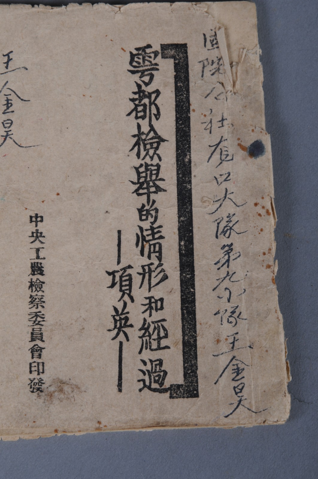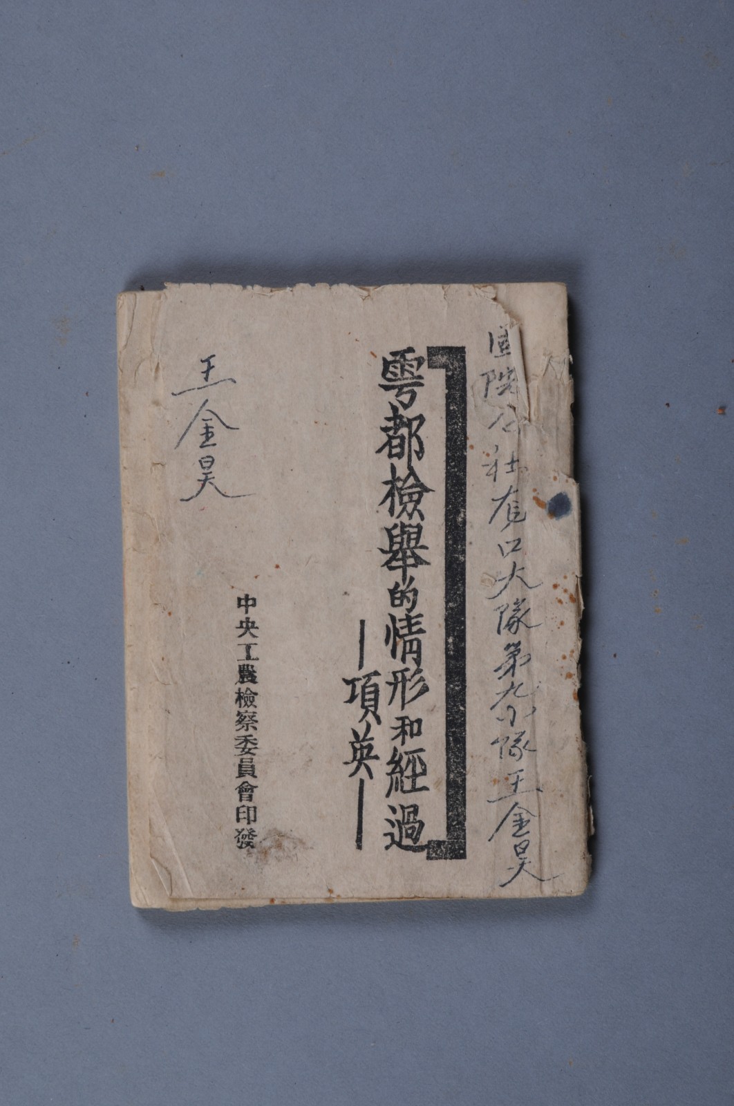 重纸,竖式双面排版铅印,含封面、封底共54页,纸装成册,篇幅较小。封面印有竖式标题“于都检举的情形和经过” 项英及印发委员会, 另有钢笔手写字样“固院公社龙口大队第九小队王金昊”。此系项英同志于1934年代表中央党务委员会与中央工农检察委员会到于都开展检举工作后所写的工作报告。主要内容包括:于都问题的爆发、于都所发现的严重现象、检举经过与开展及结论共四个方面,最后落款为“中央工农检察委员会”及时间:1934年3月28日。封底无内容。