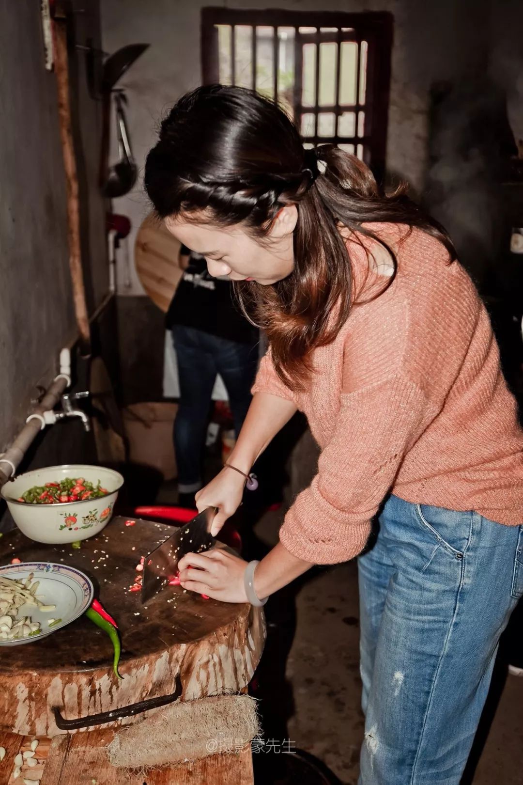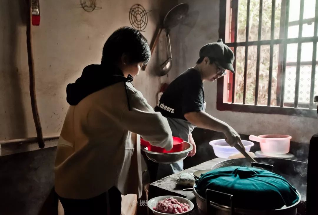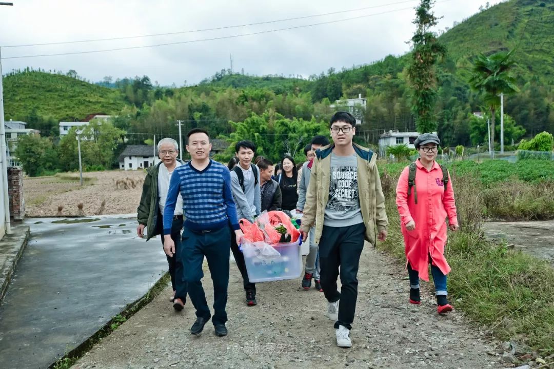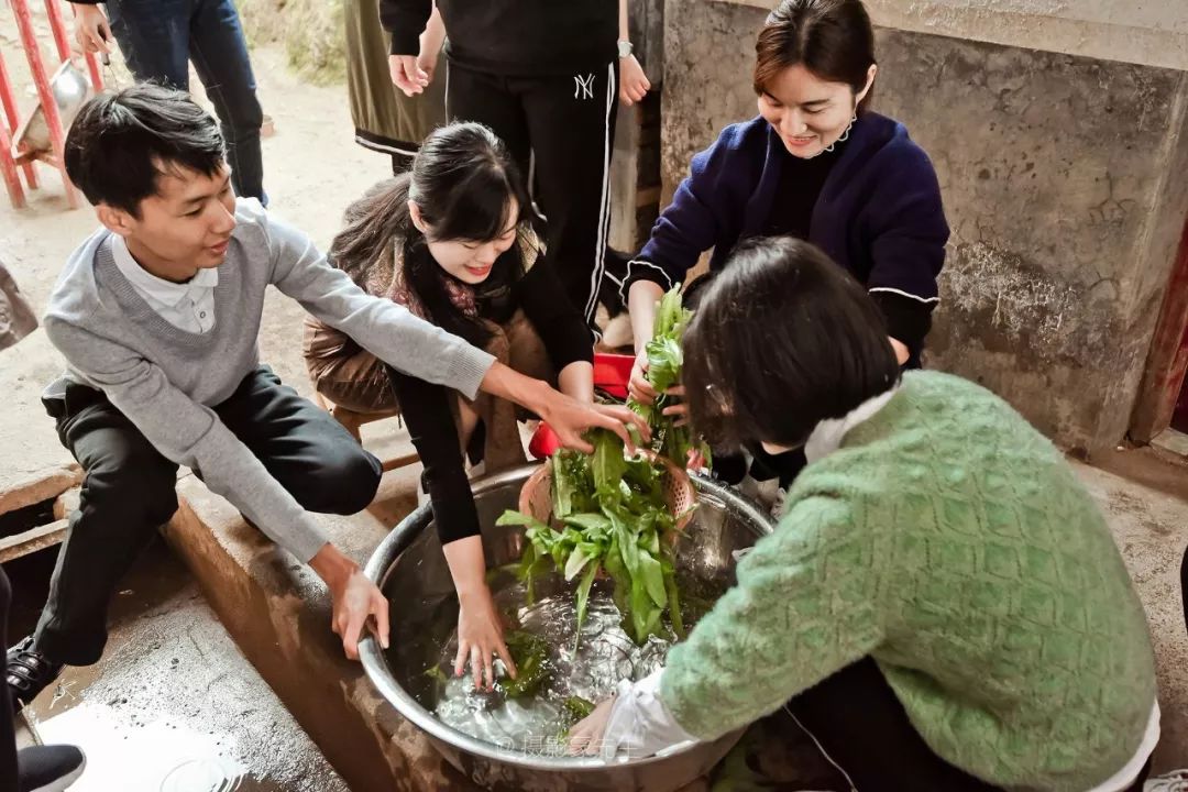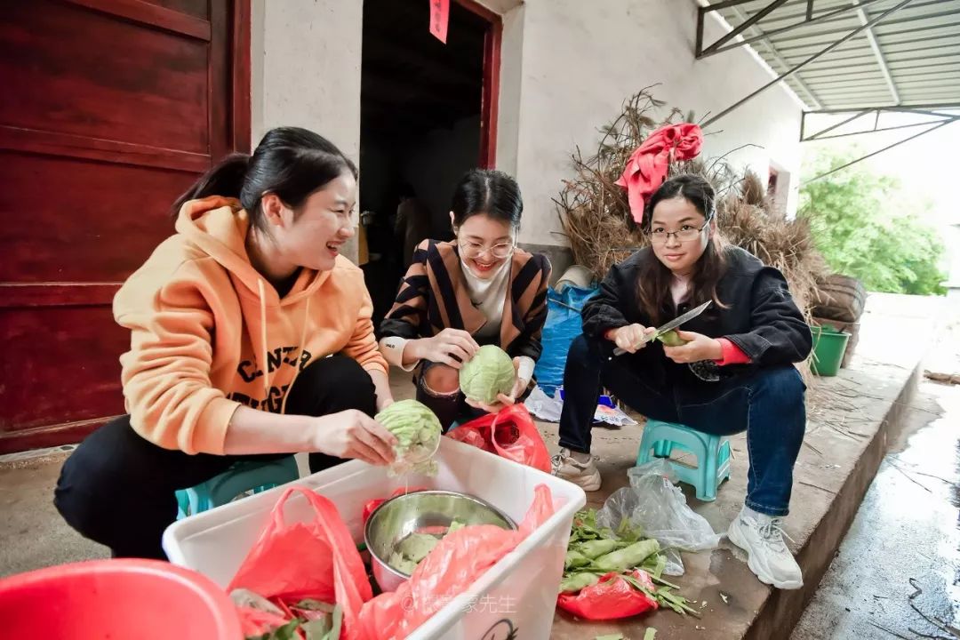 为了和红军后代拉近距离,我们出发前采购了一些食材,准备给曾伯伯一家用心做一顿午餐。茶后,同志们就各显身手忙活起来了,生火、配菜、炒菜,厨里厨外忙得不亦乐乎。支部书记、馆长轮番掌厨,姑娘小伙们叽叽喳喳利落地洗菜、切菜、打扫院落,剩下的在院里穿着蓑衣、戴着斗笠演于博版《渡情》,逗乐了村子里的老农,小山村顷刻间似乎欢腾起来了......约摸一个小时的功夫,我们盛上满满的一桌菜。我们围桌而坐,让曾昭梁和他的夫人坐上席,仿若一家人。同志们以茶代酒,举杯敬过曾昭梁一家,表达我们的敬意。
