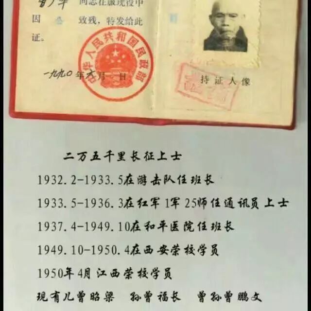曾广华1932年参加红军,参加了长征,之后还参加了抗日战争和解放战争,戎马生涯十余年,留下了四处枪伤。1949年10月从陕西荣誉军人学校转到江西荣誉军人学校,1950年11月退役复员。复员军人登记表上简单记录着他的革命生涯,但在“本人对今后的工作打算”那一栏填写的内容特别让人感动,填写的是“复员回家种田”。据说当年组织上征求了曾广华的意见,准备让他在县里担任副县长职务,但曾广华说自己没文化,家乡还有地,种地比较适合自己。多少年后,曾昭梁后来也动员自己的父亲向组织上要待遇,却遭到父亲的严厉批评。父亲曾广华说,自己能幸存下来就很幸运了,很多战友都牺牲了,再也回不了家乡。