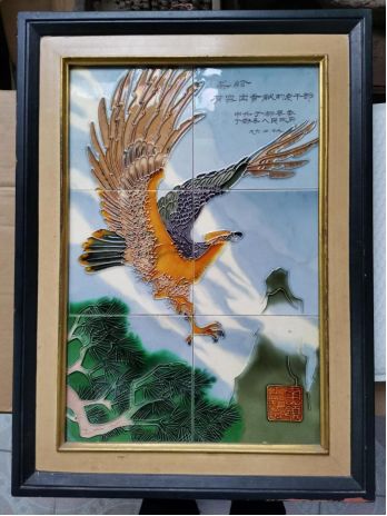 这幅瓷板画是1996年4月25日中共于都县委、于都县人民政府奖励给具有突出贡献的老干部的一件物品。它由南岭工艺出品,内容集中展现一只搏击长空的雄鹰,寓意深刻。