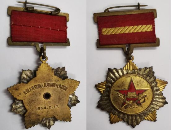紧接着肖老师从帆布包里掏出一枚“全国人民慰问解放军代表团赠”纪念章说:“这是他在县城的一栋老房子里‘淘宝’淘来的”。虽然这枚纪念章已经锈迹斑斑,却仍然向我们诉说着主人的赫赫战功!