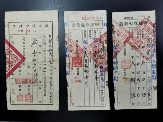 最后,肖老师还将家中保存良好的三张上个世纪五十年代收据捐赠给了我们馆。三张收据依次分别是:1951年江西省人民政府财政厅出具的甲种公粮收据,1952年-1953年于都县人民政府出具的农业税收据及收据联。