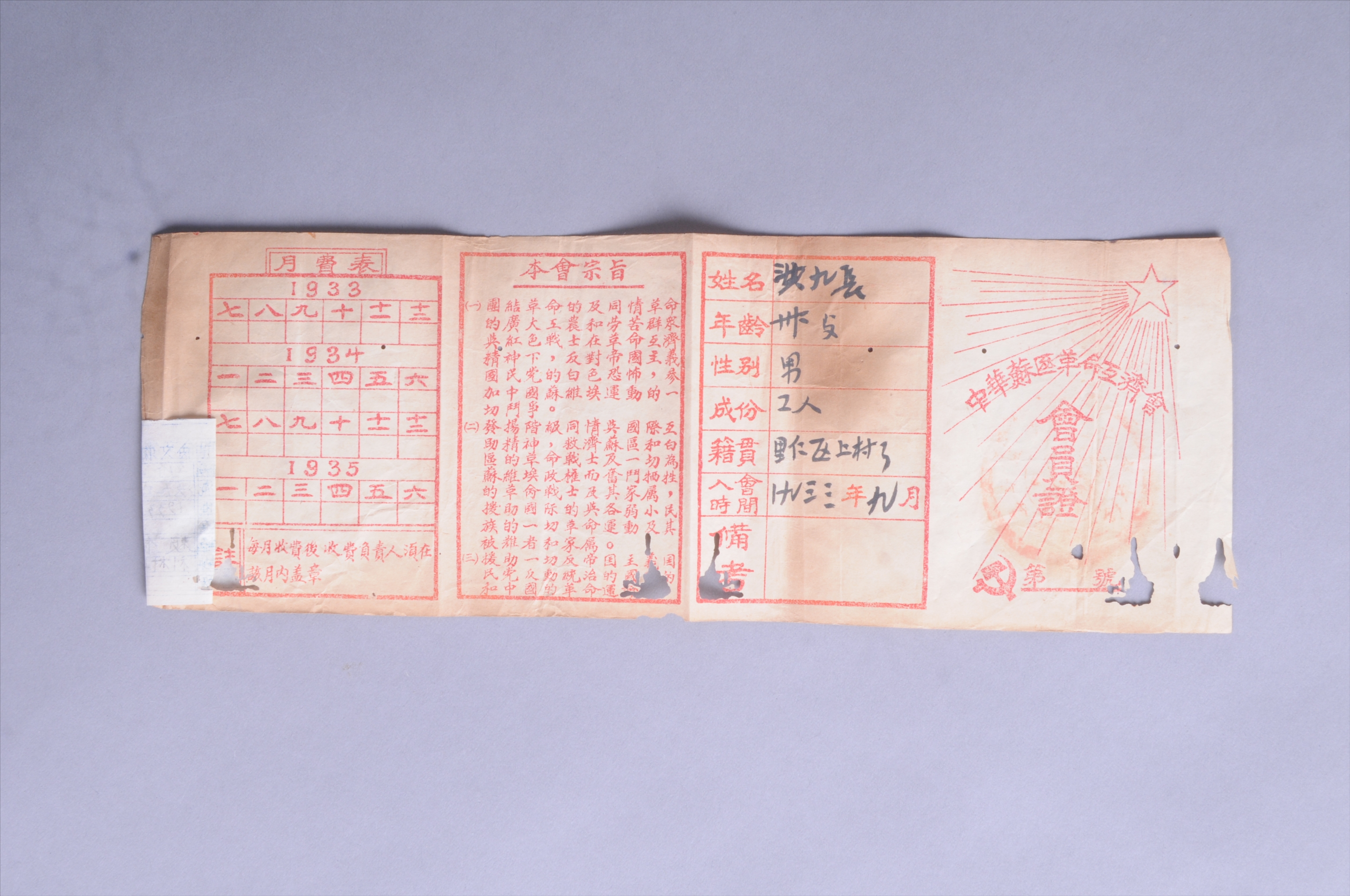200196★1933年洪九长的中华苏区革命互济会会员证