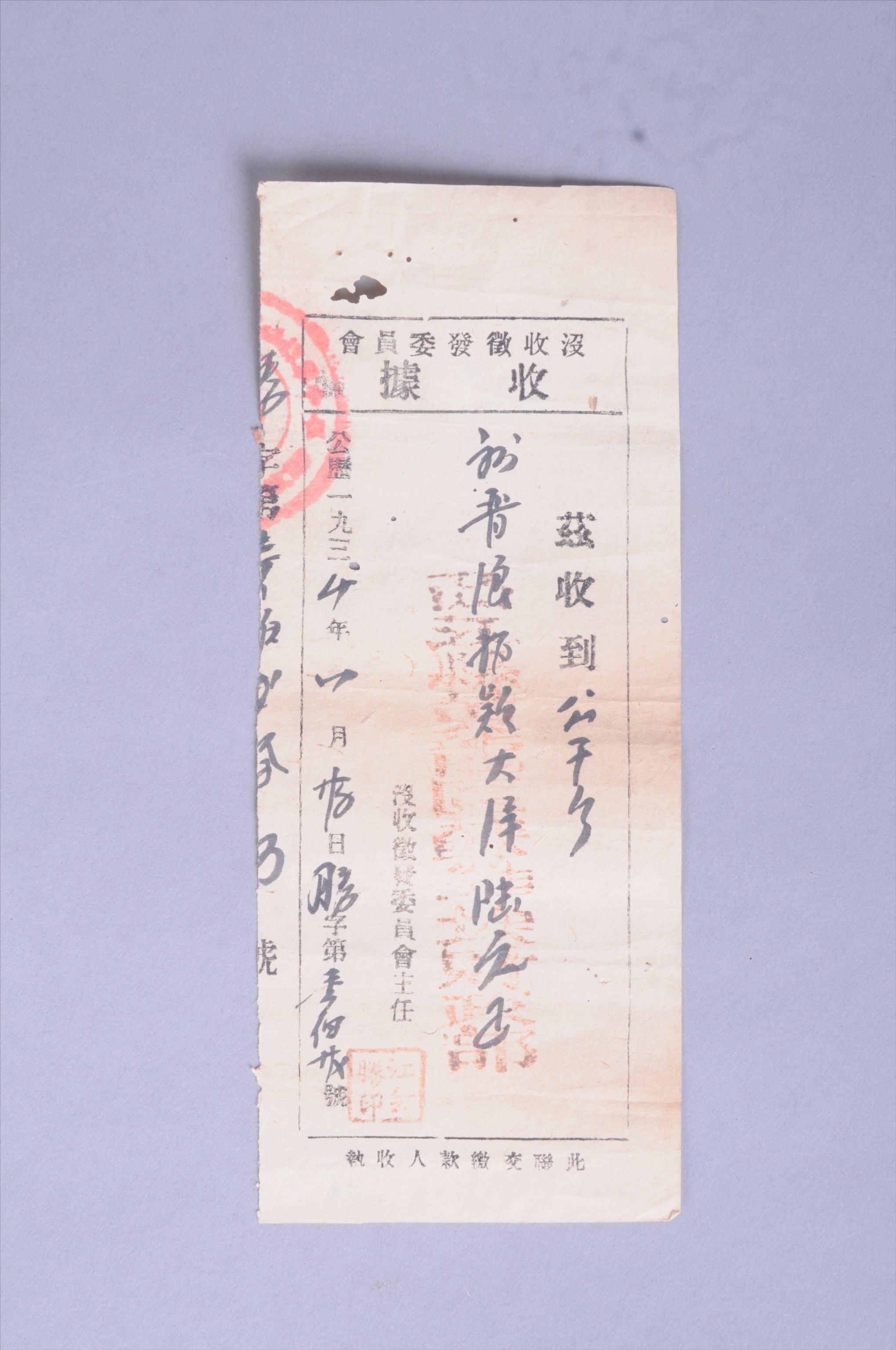 200696★1934年西江县黄龙区财政部没收征发委员会发给公干乡谢晋浪的收据