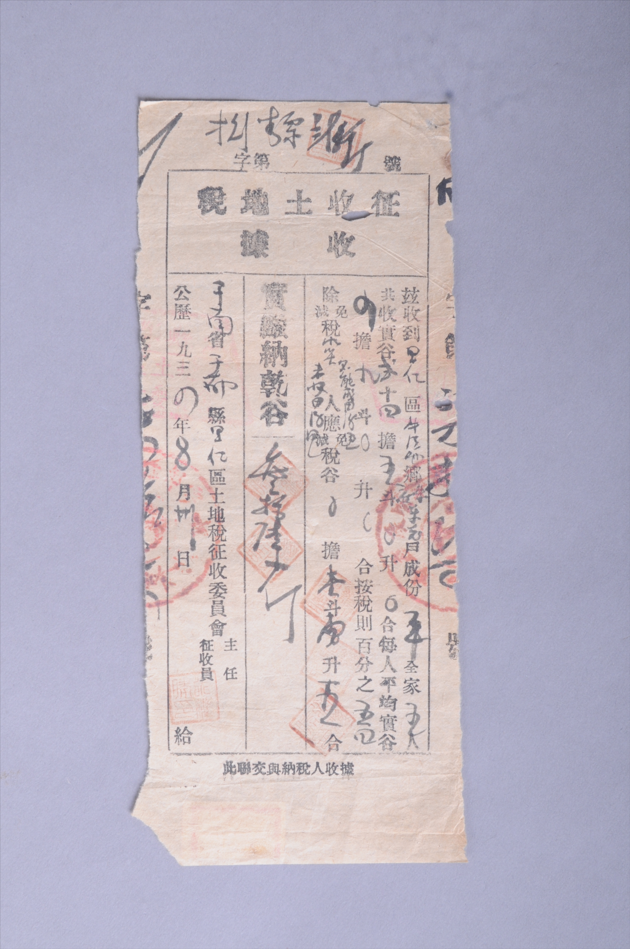 200537★1934年赣南省于都县里仁区土地税征收委员会发给朱东远的征收土地税收据