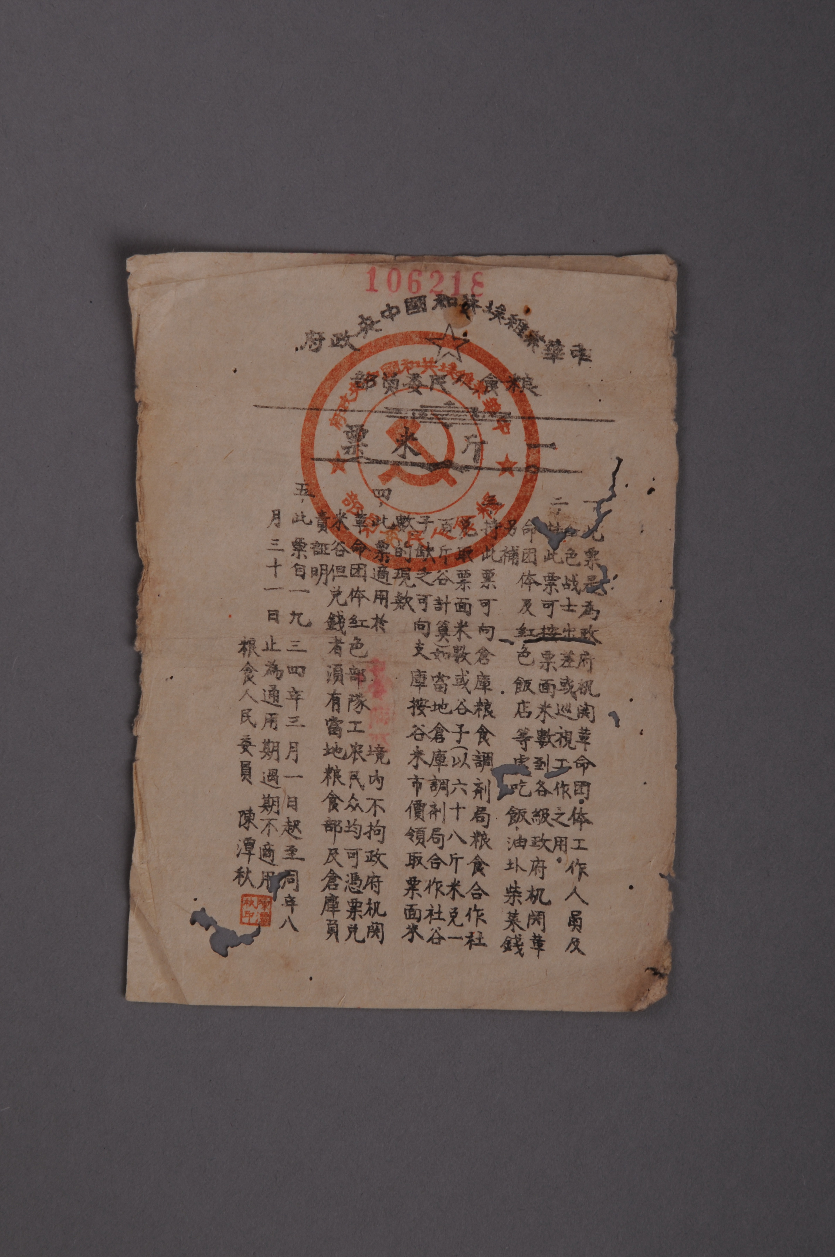 200918★1934年中华苏维埃共和国中央政府粮食人民委员部一斤米票