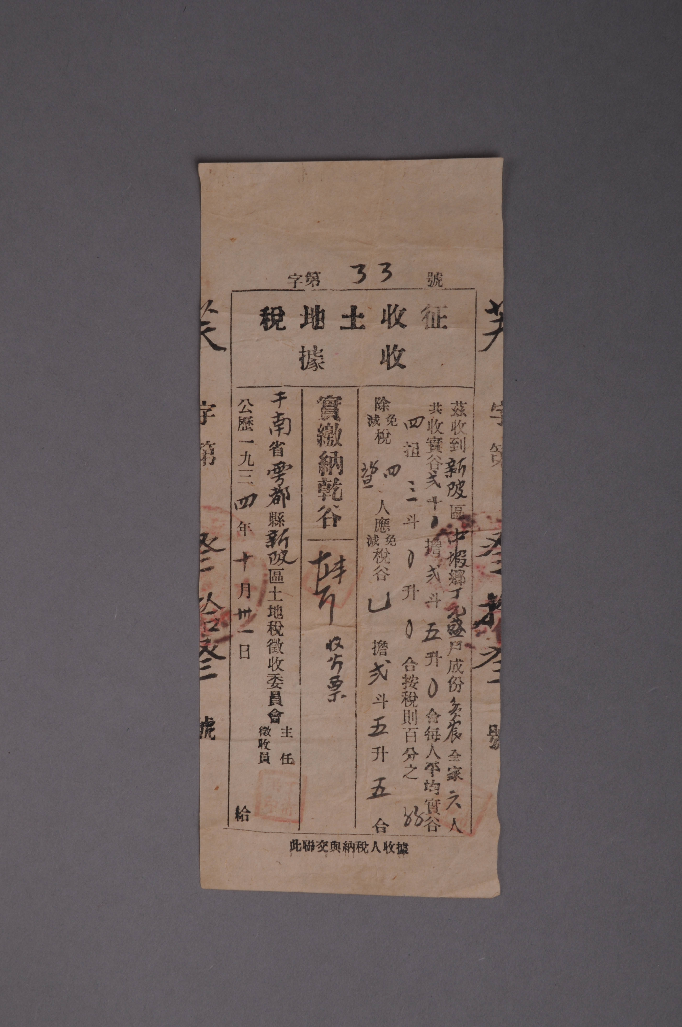 200582★1934年赣南省雩都县新陂区土地税收委员会发给丁元盛的征收土地税收据