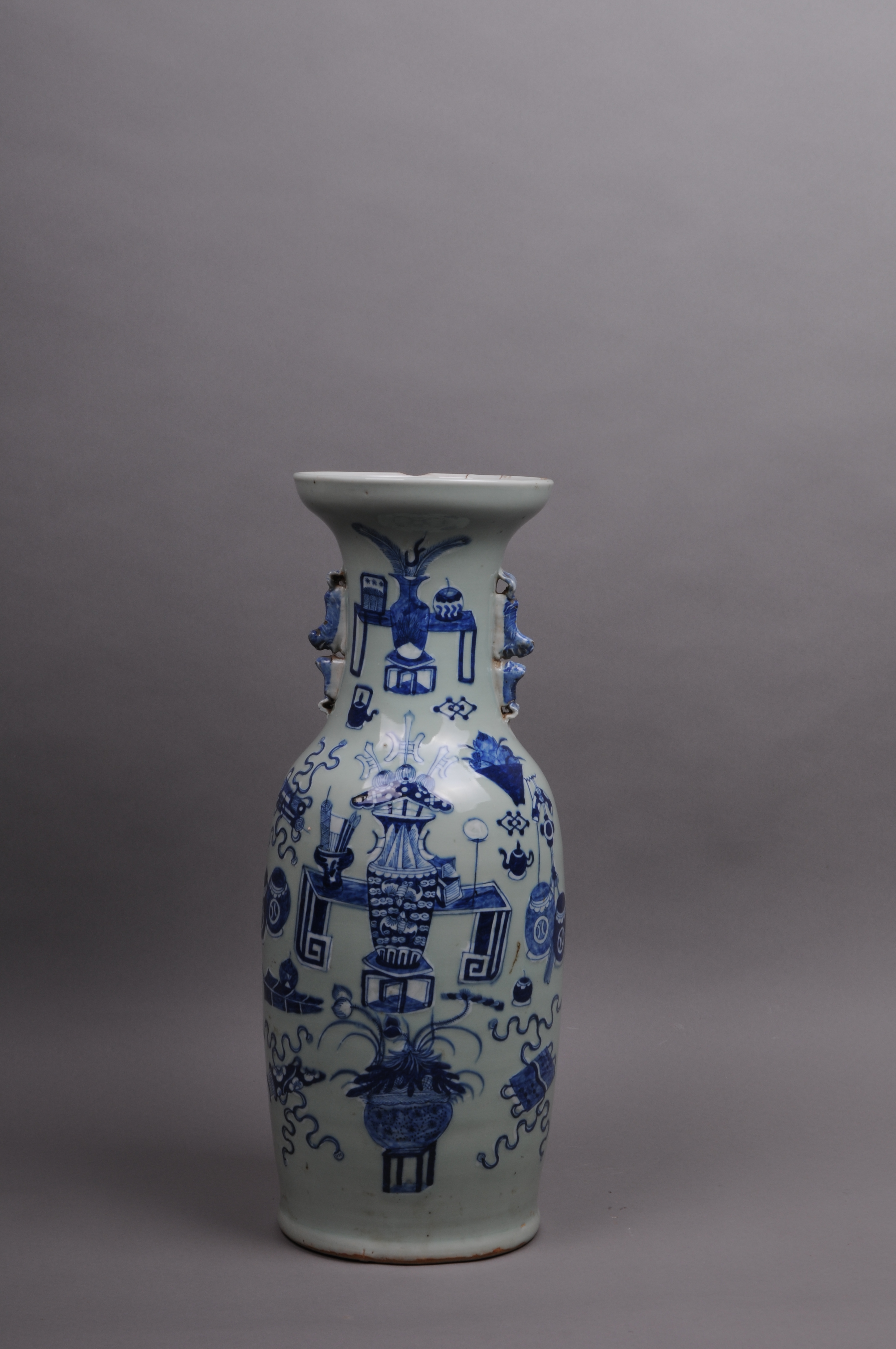 100064清豆青釉青花博古图双耳瓶