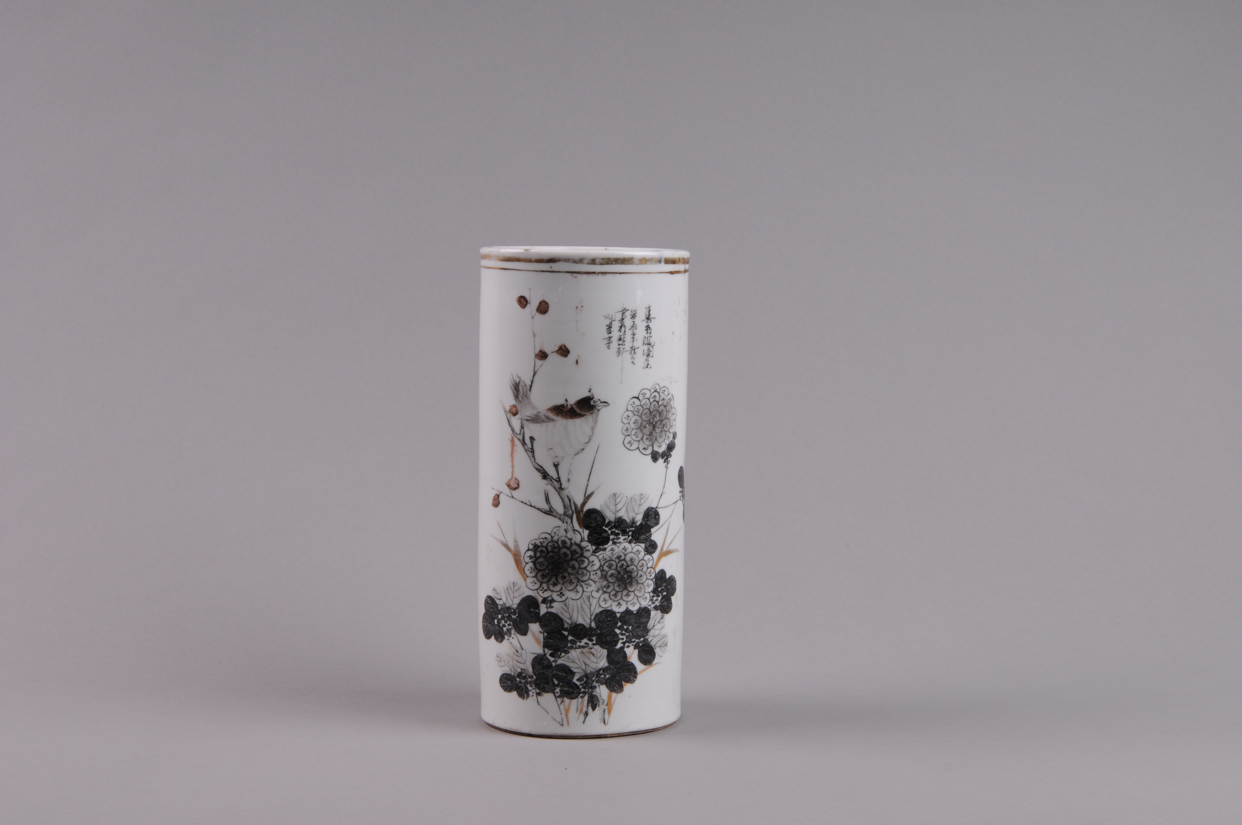 100069民国景德镇窑墨彩描金花鸟纹帽筒