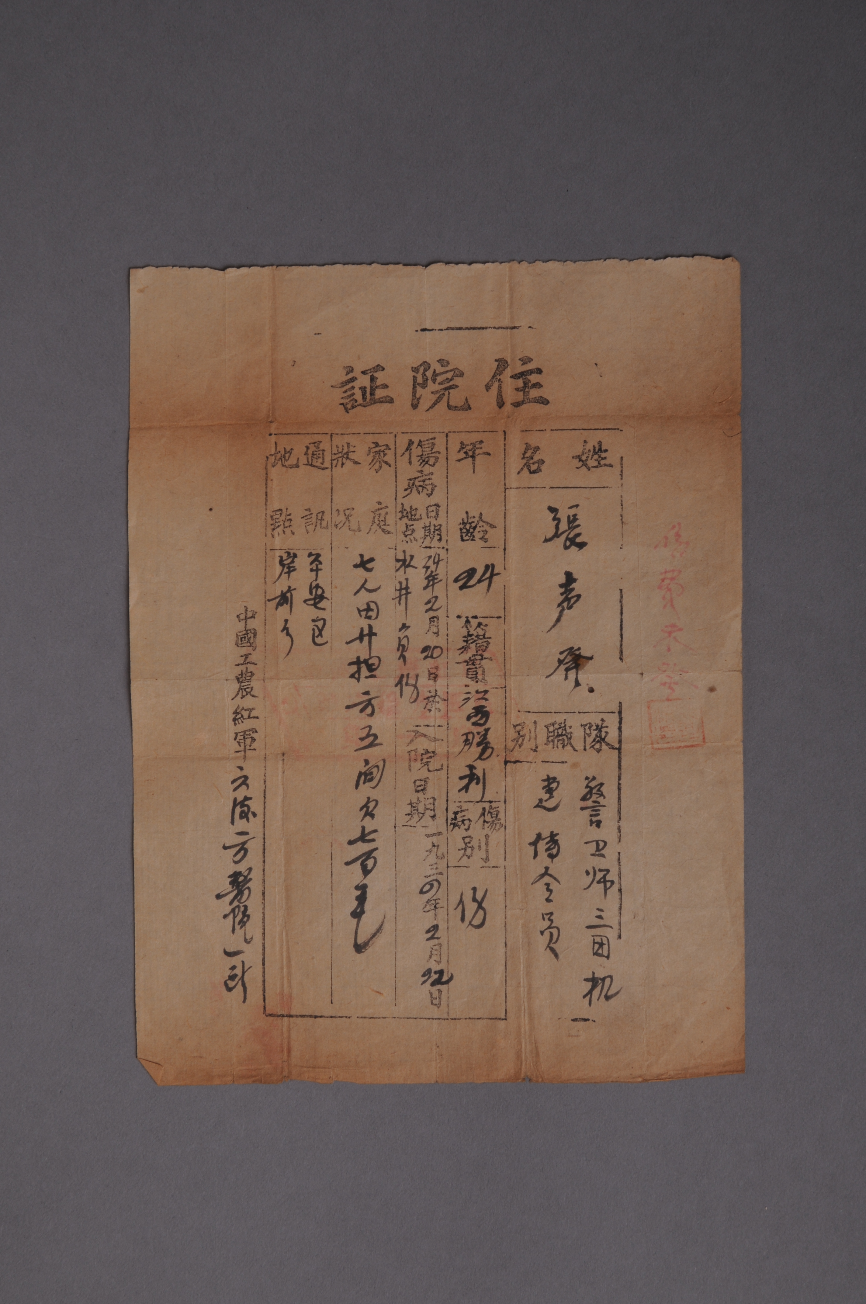 200187★1934年中国工农红军六后方医院一所出具给张声发的住院证