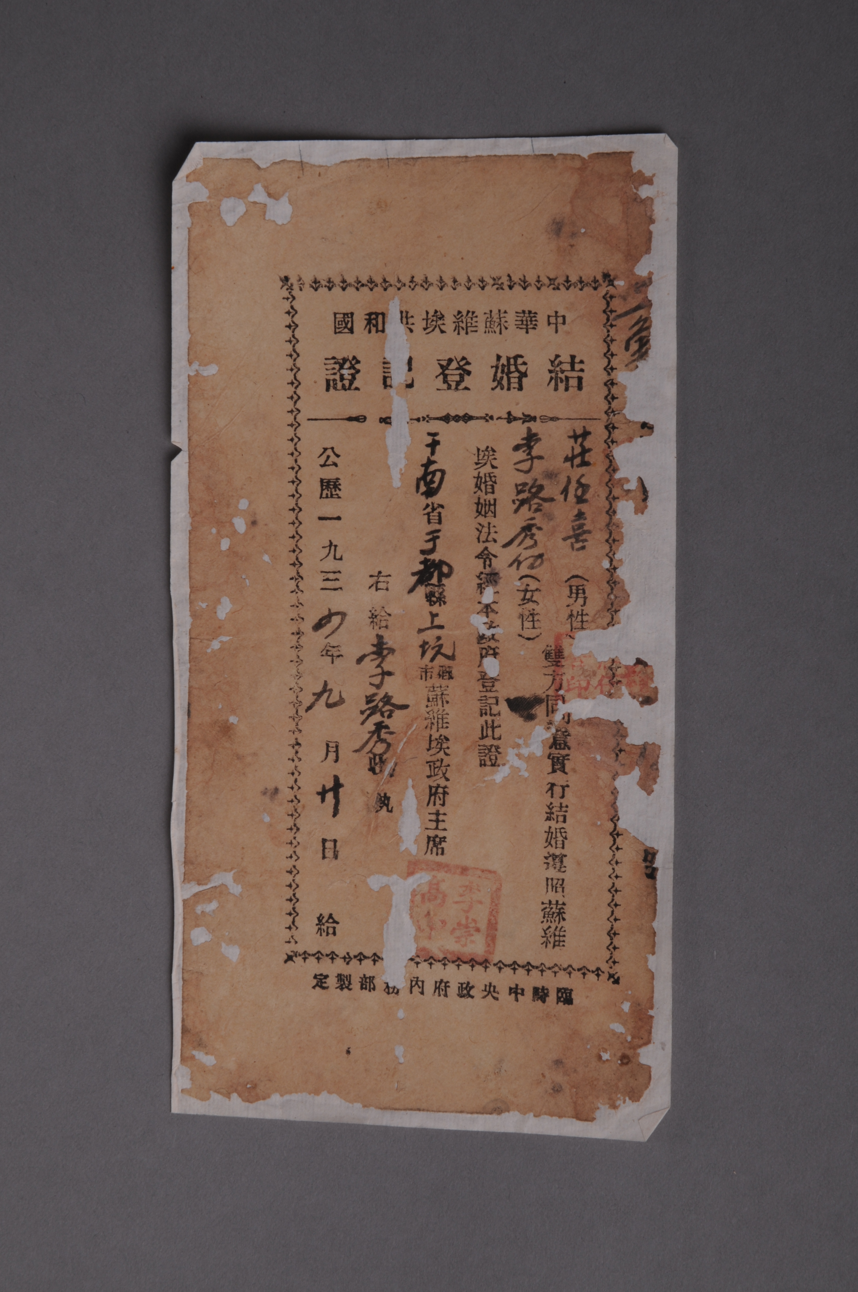 200192★1934年赣南省雩都县上坑乡苏维埃政府颁发给庄任喜与李路秀的结婚登记证