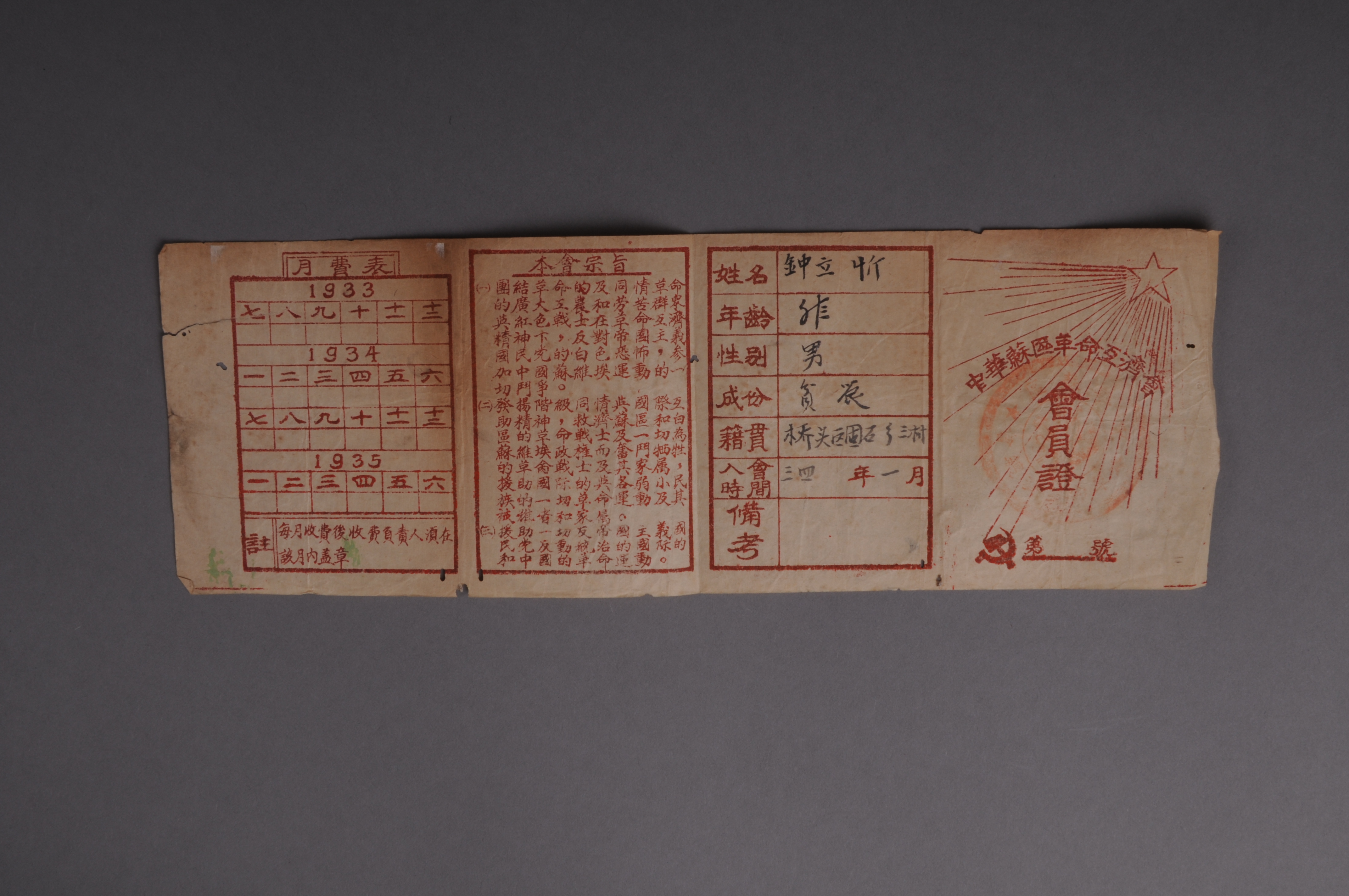 200223★1934年中华苏区革命互济会颁发给钟立忻的会员证