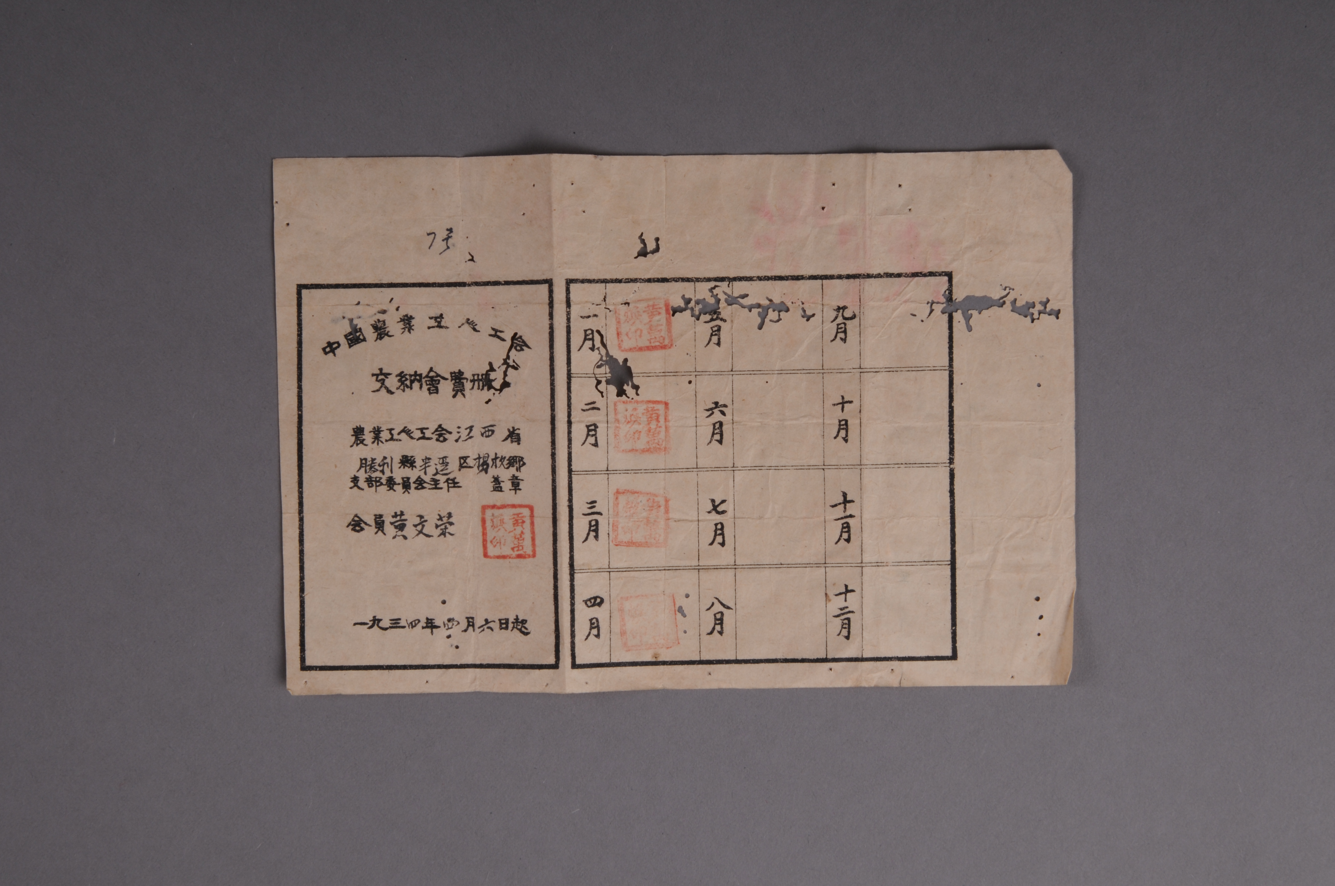 200267★1934年中国农业工人工会江西省胜利县半迳区杨枚乡支部颁发给黄文荣的中国农业工人工会交纳会费册