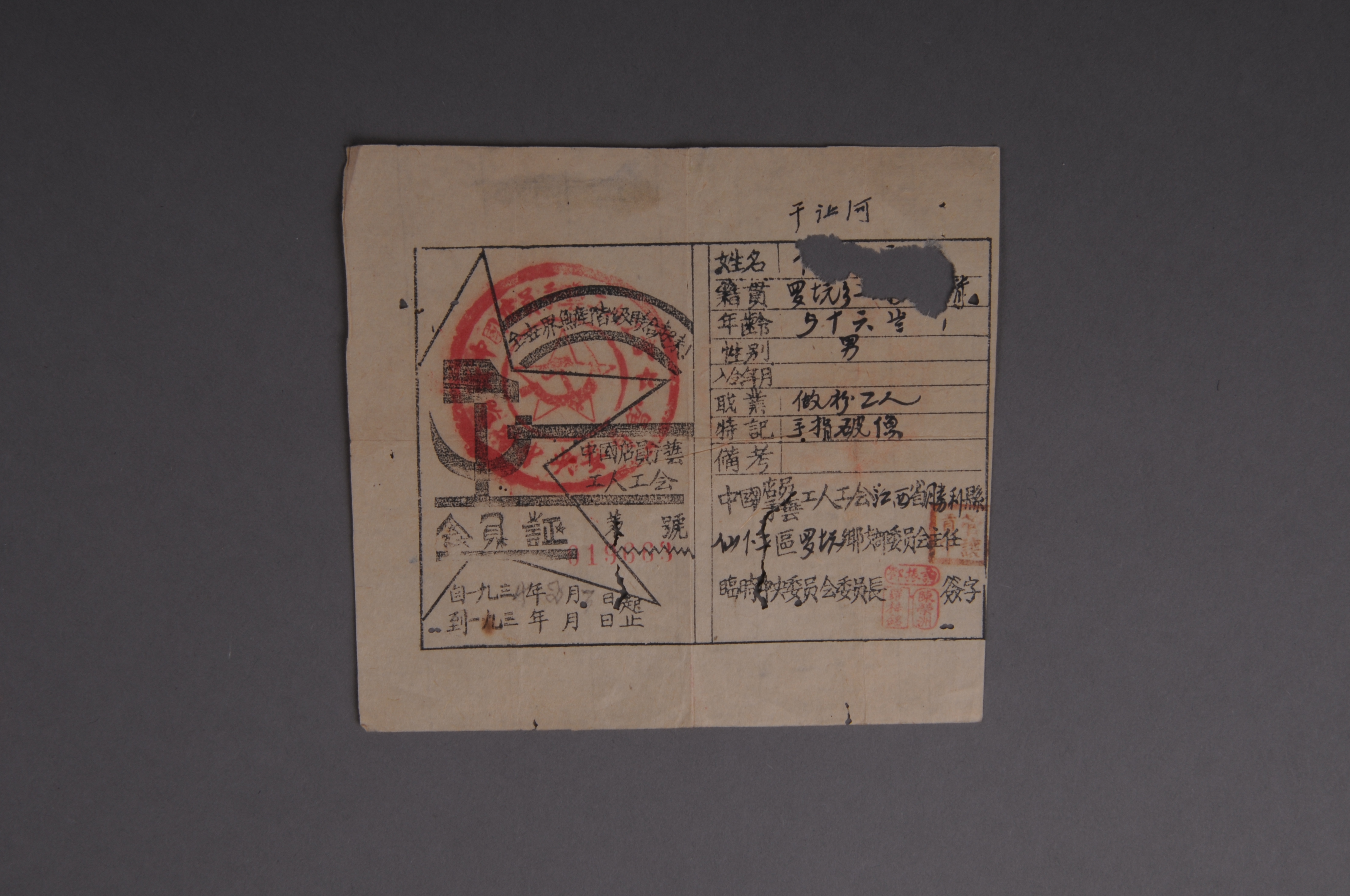 200270★1934年于让河的中国店员手艺工人工会会员证