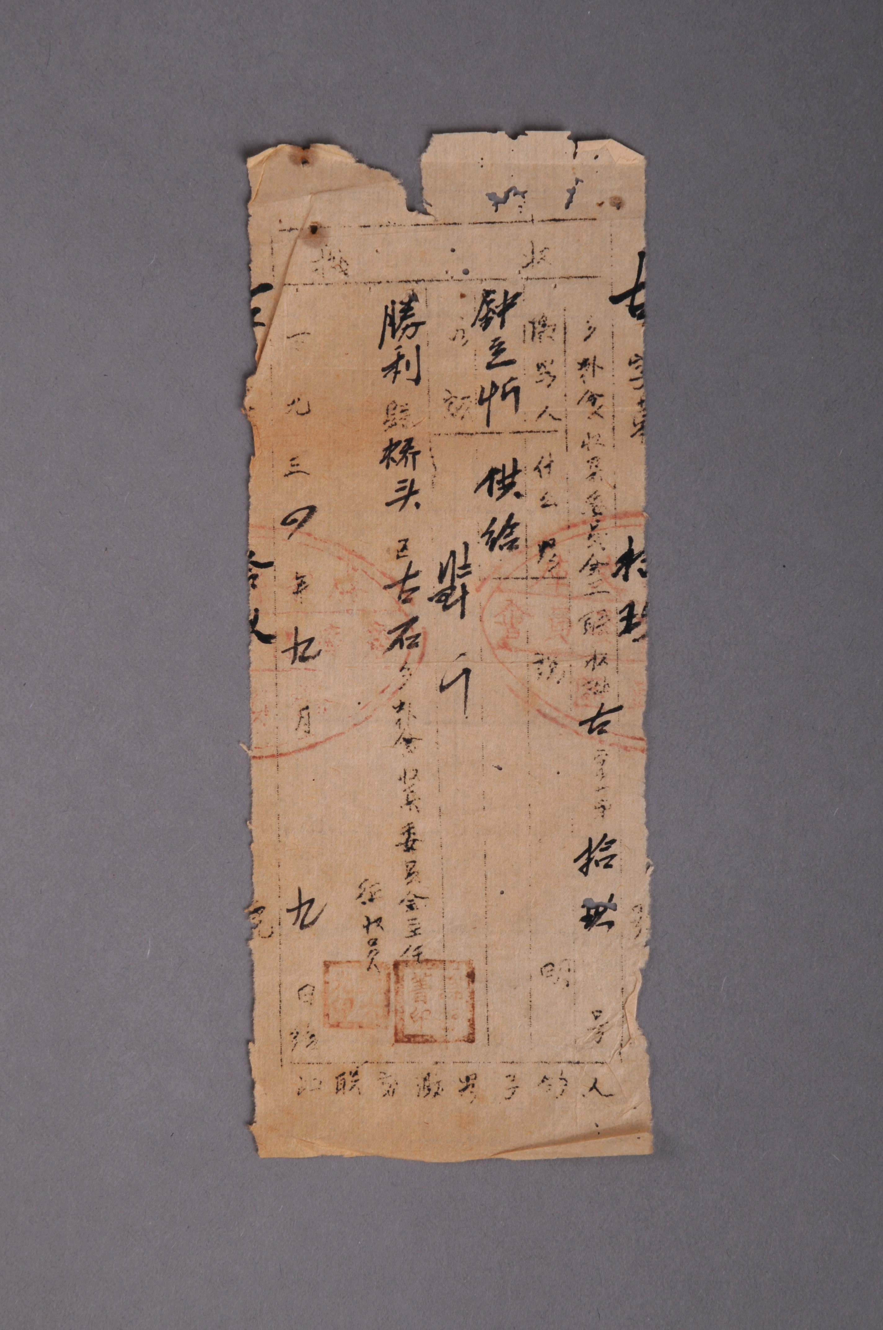 200372★1934年胜利县桥头区古石乡粮食征收委员会出具给钟立忻的收据