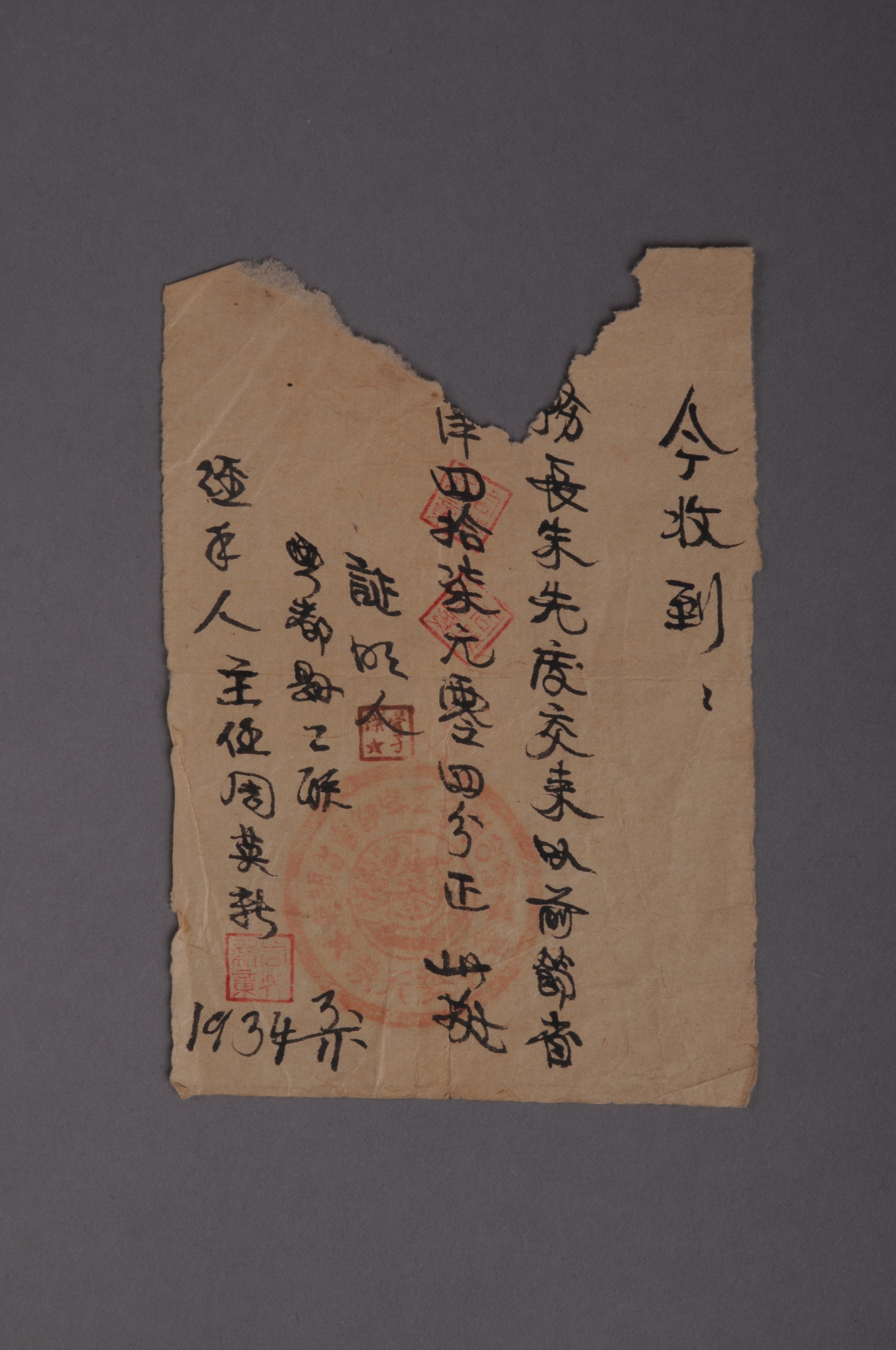 200374★1934年粤赣省雩都县工会联合会出具给朱先度的收据