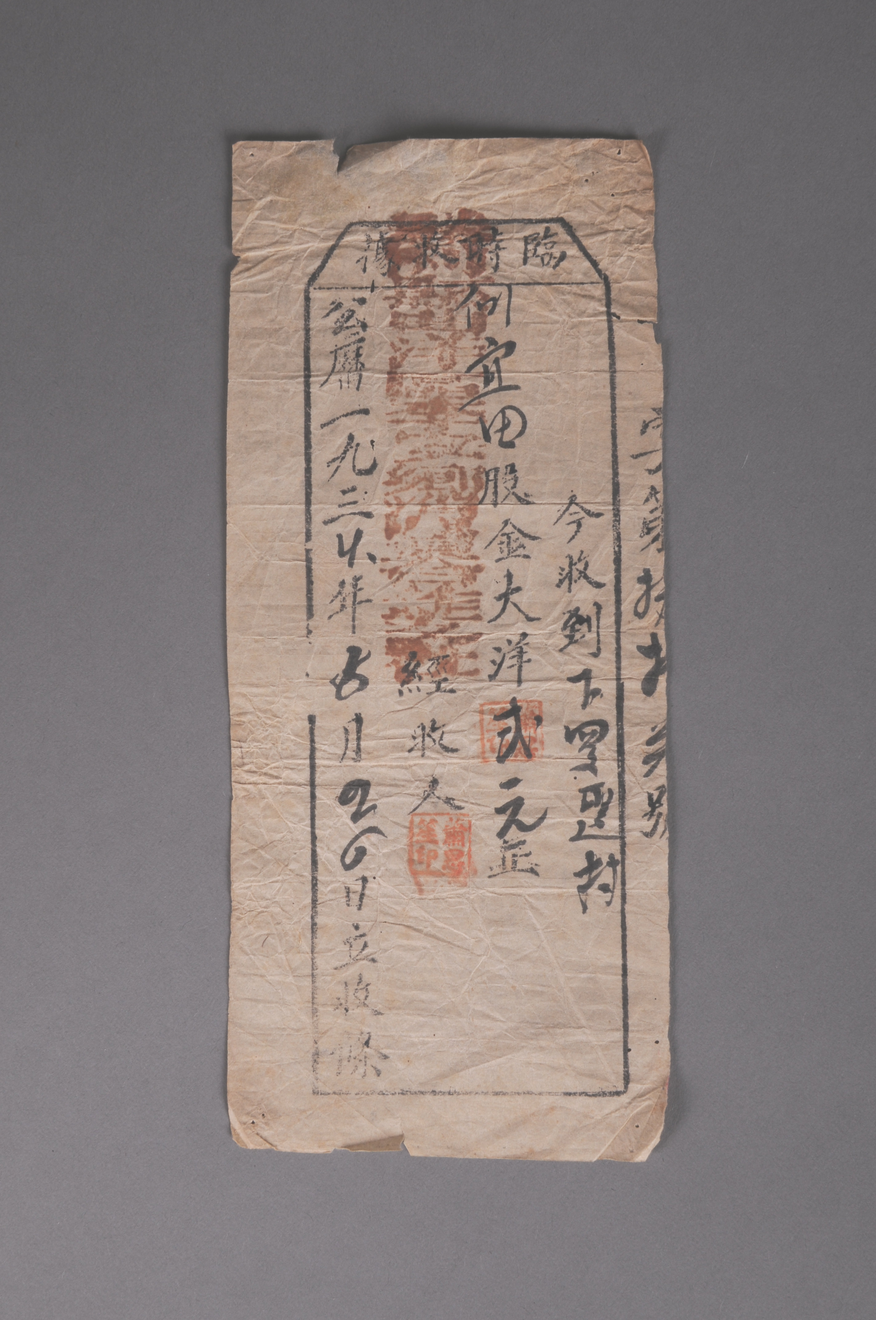 200386★1934年胜利县曲洋区李安乡消费合作社发给何宜田的临时收据