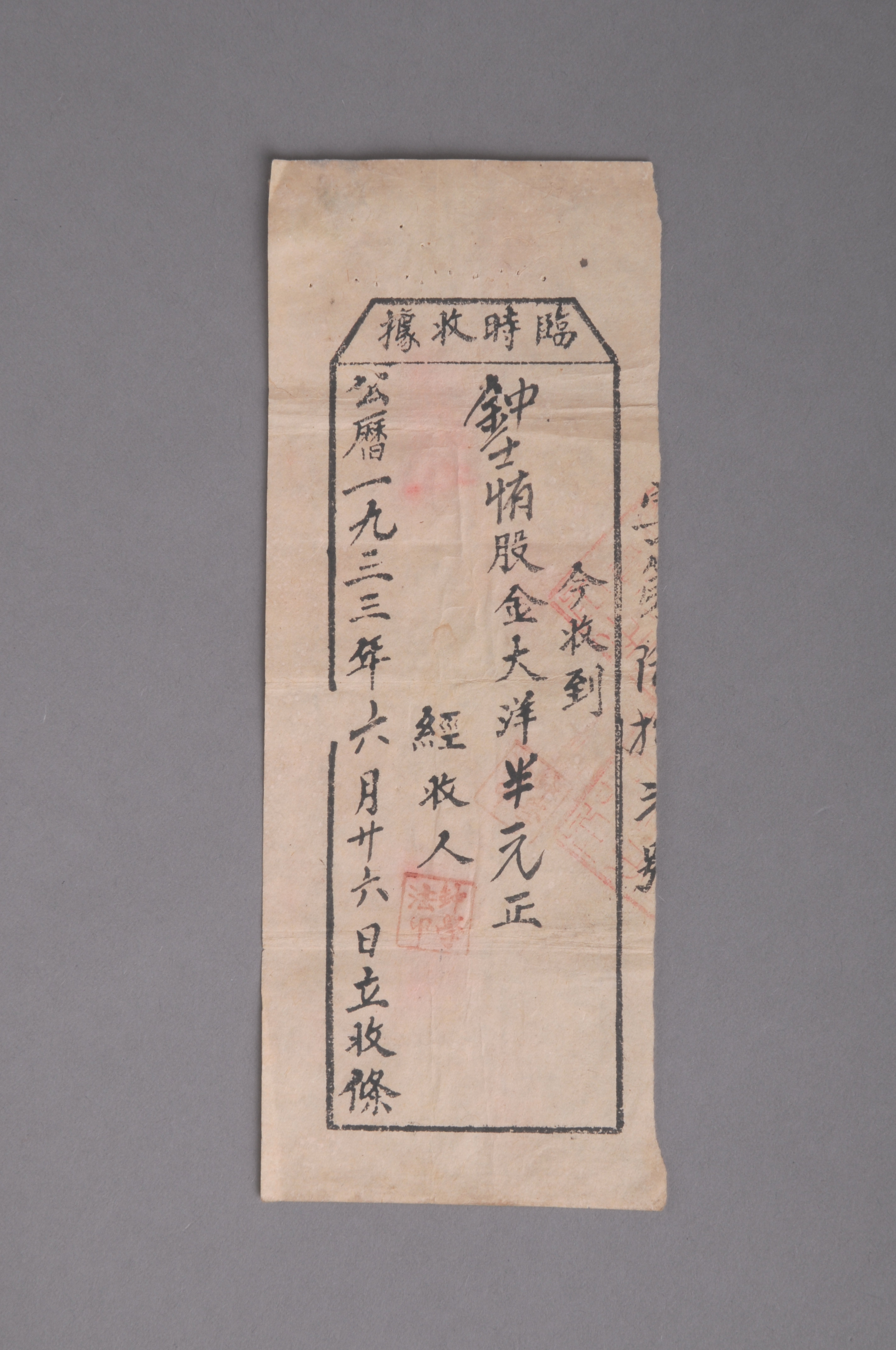 200392★1933年胜利县银坑区总消费合作社发给钟士忄有的临时收据