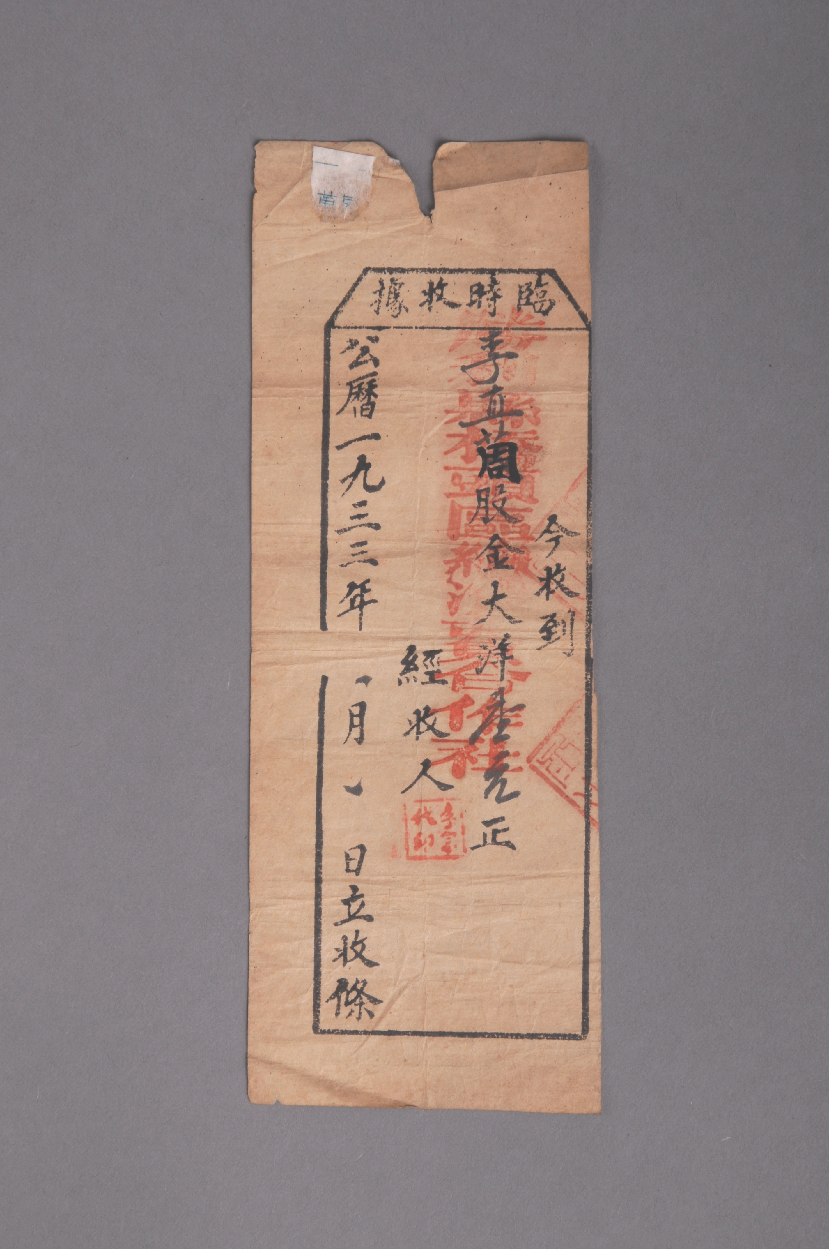 200393★1933年胜利县桥头区总消费合作社发给李直□的股金临时收据