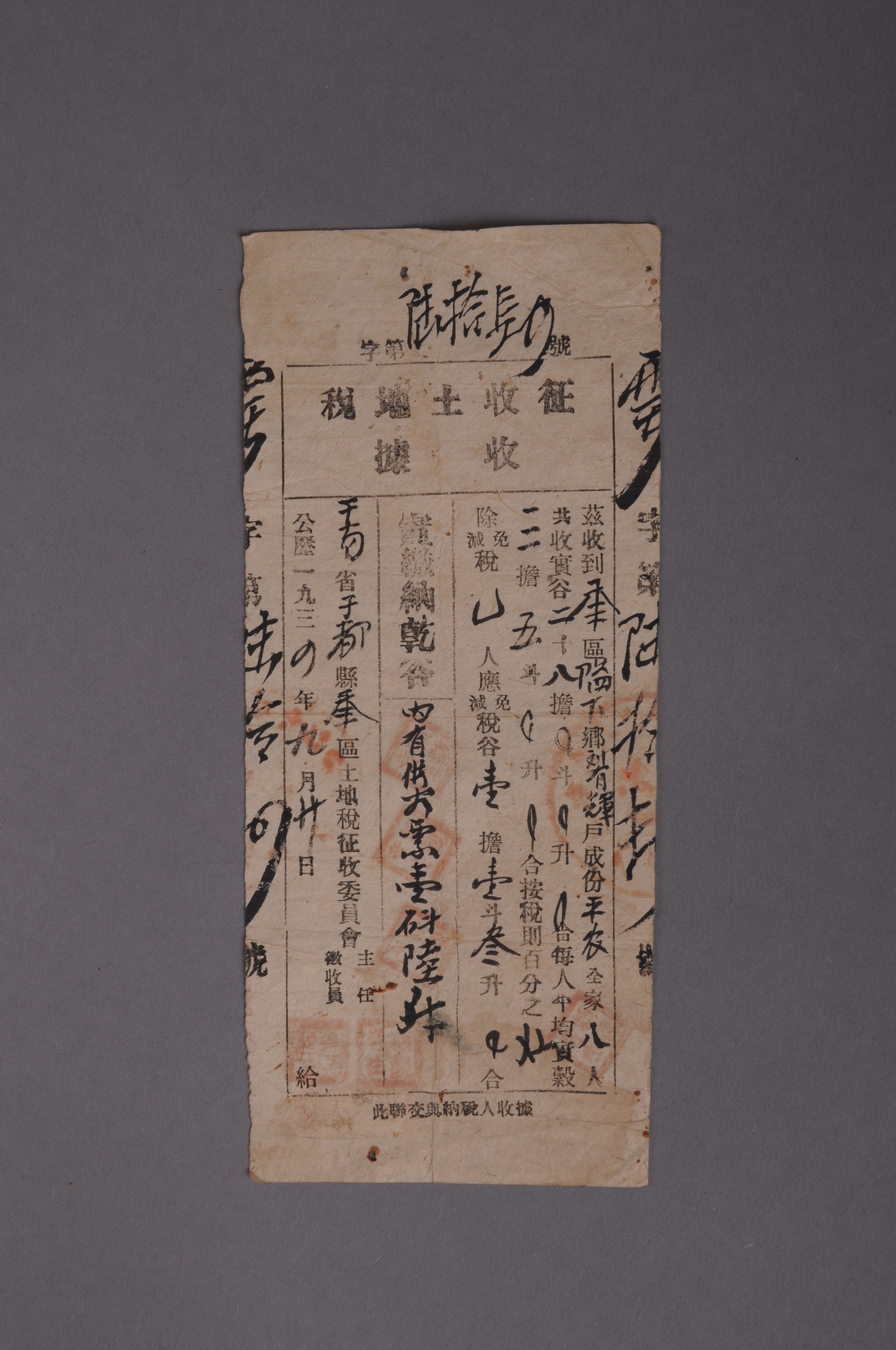 200583★1934年赣南省雩都县禾丰区土地税征收委员会发给隘下乡刘有辉的征收土地税收据