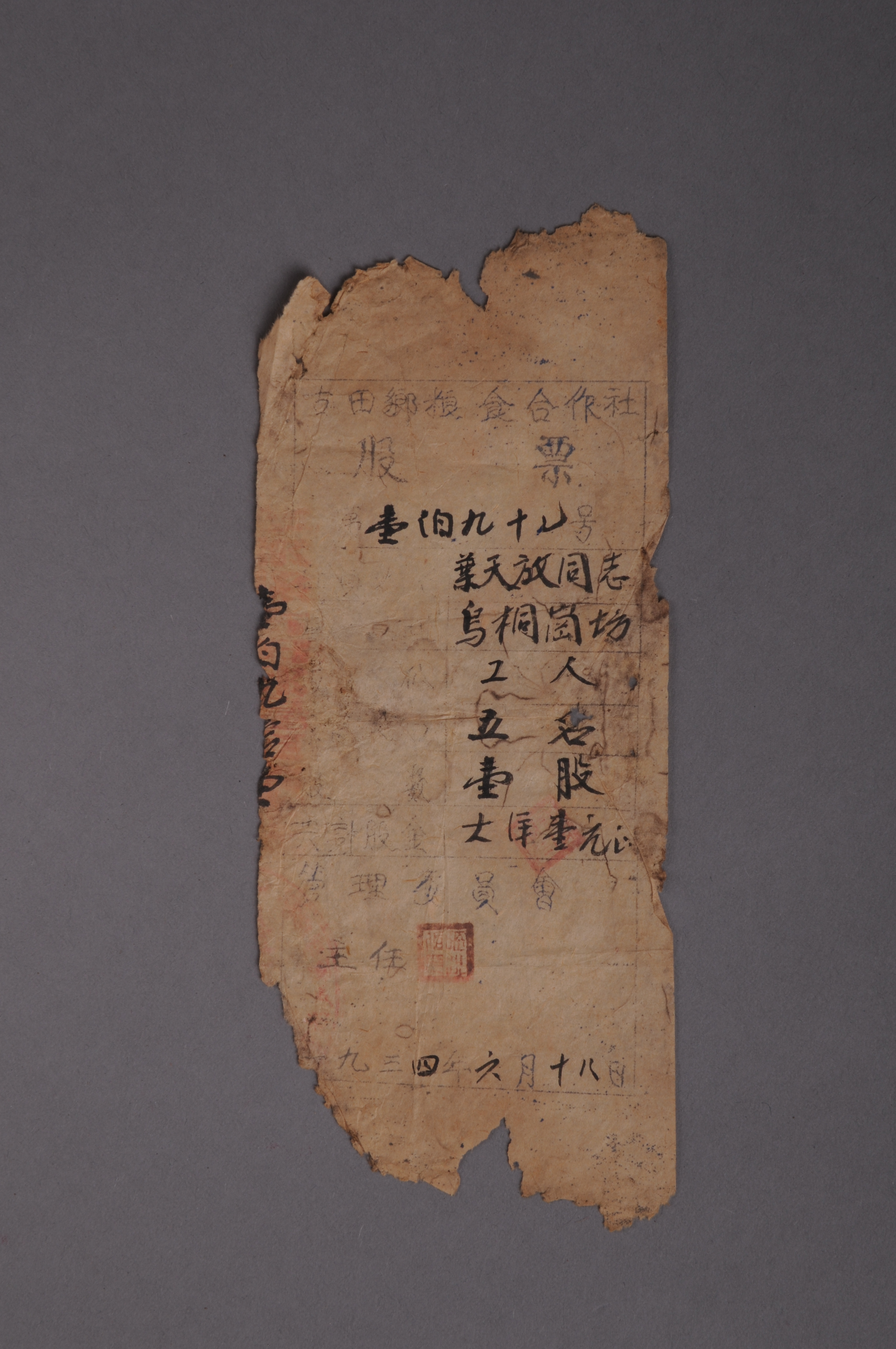 200686★1934年于都县古田区古田乡粮食合作社发给叶天放的股票