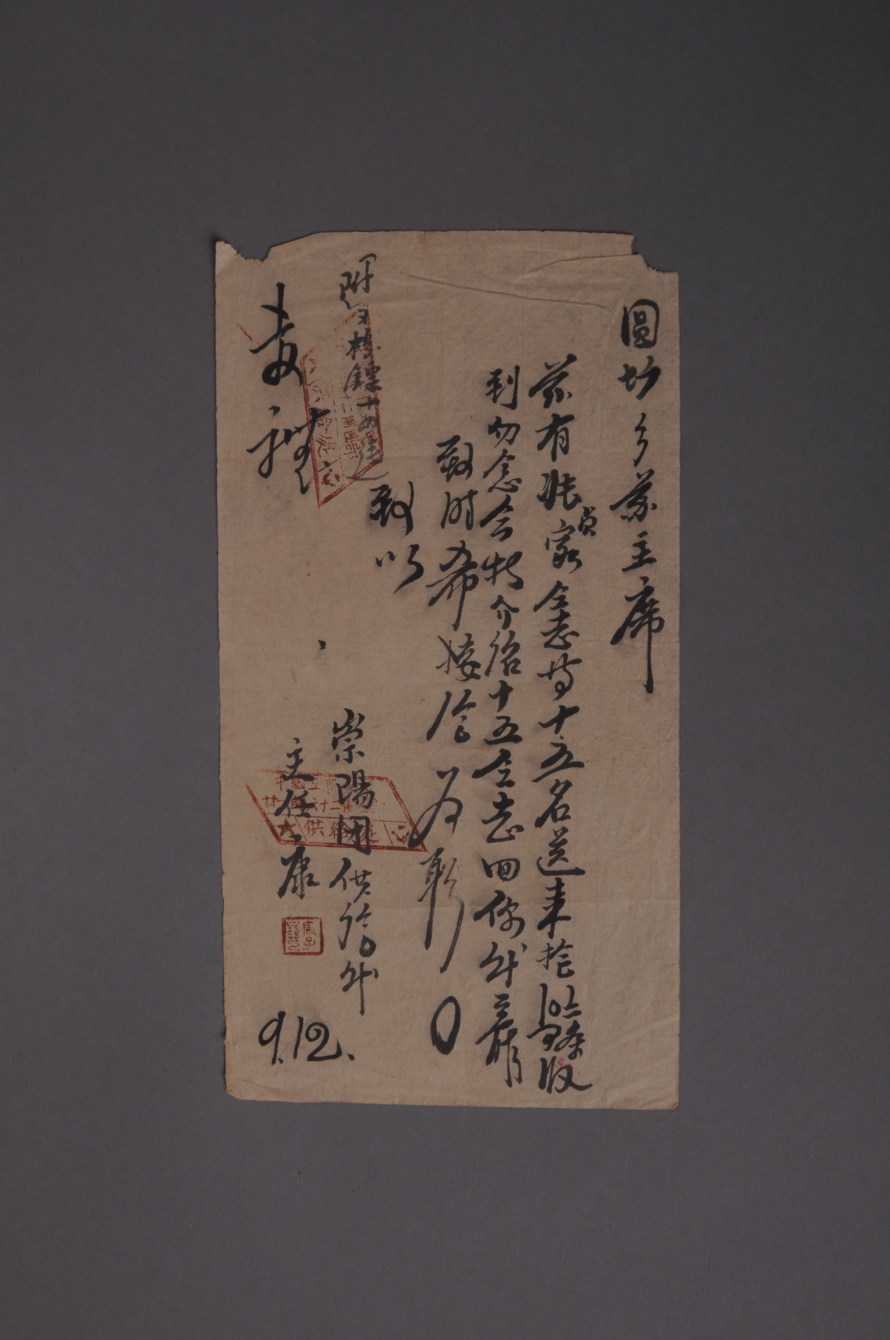 200851★第二次国内革命战争时期中国工农红军二十一师六十二团(崇阳团)团部供给处给圆塘乡苏主席的介绍信