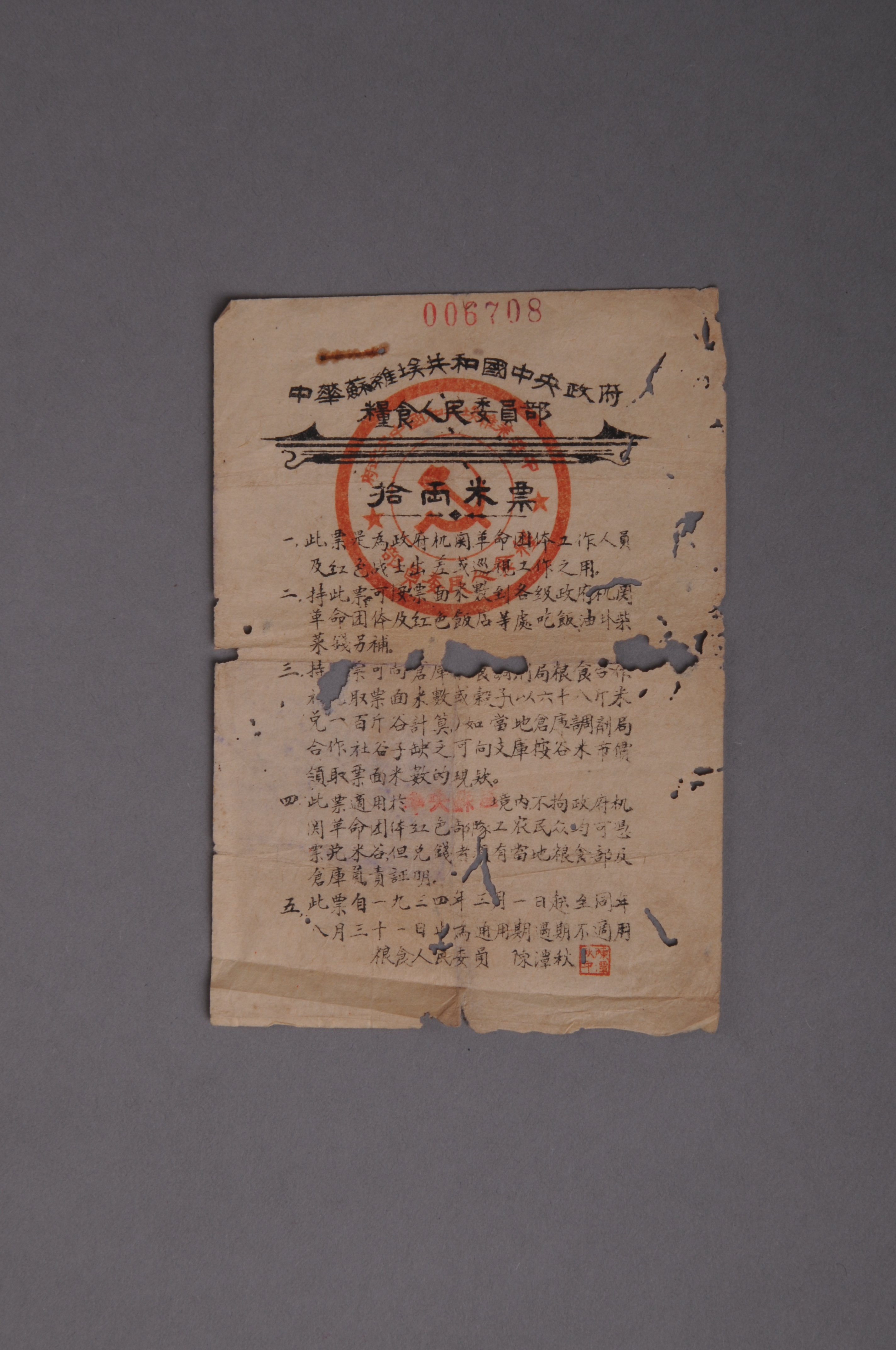 200930★1934年中华苏维埃共和国中央政府粮食人民委员部拾两米票