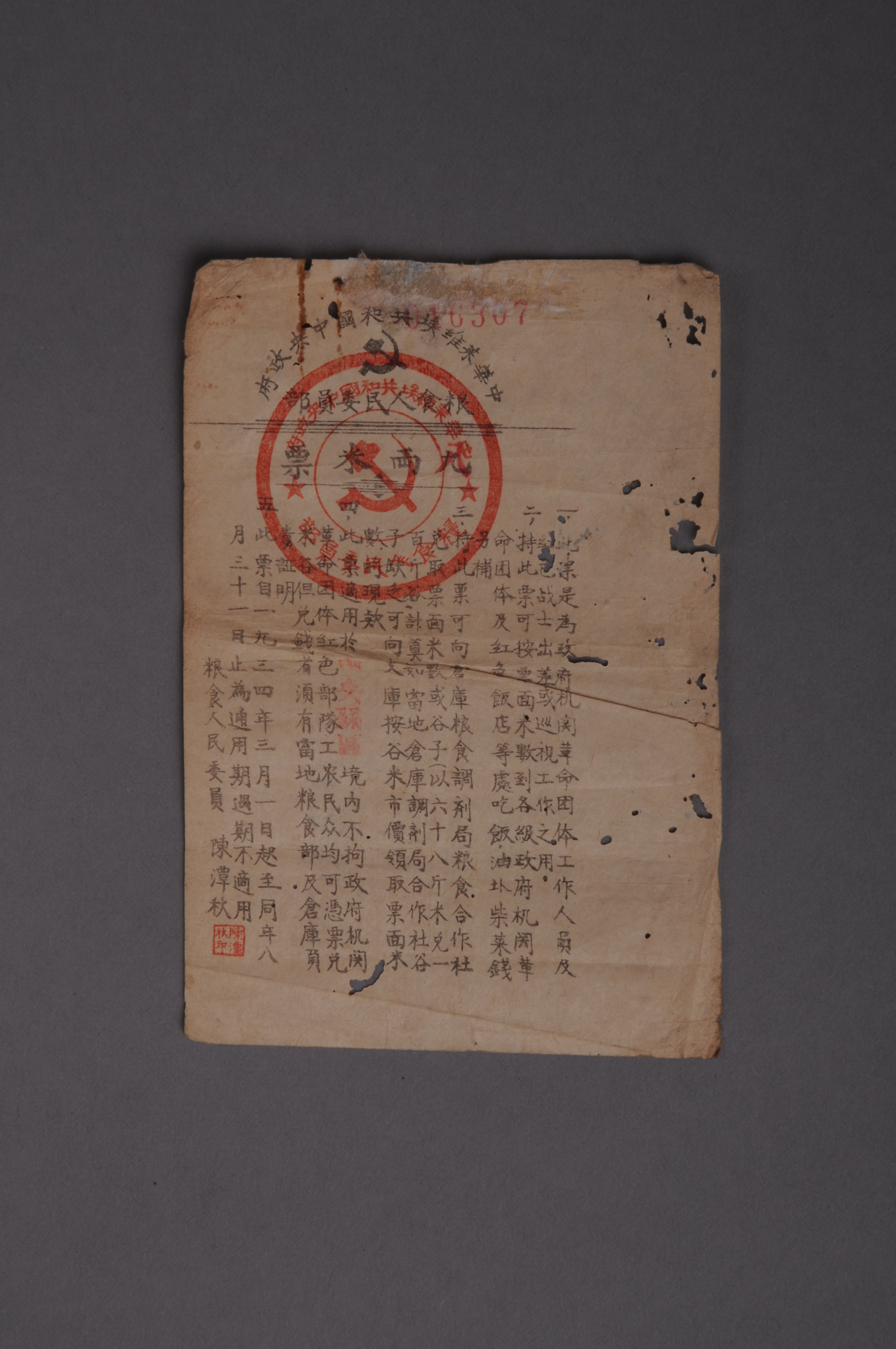 200932★1934年年中华苏维埃共和国中央政府粮食人民委员部九两米票