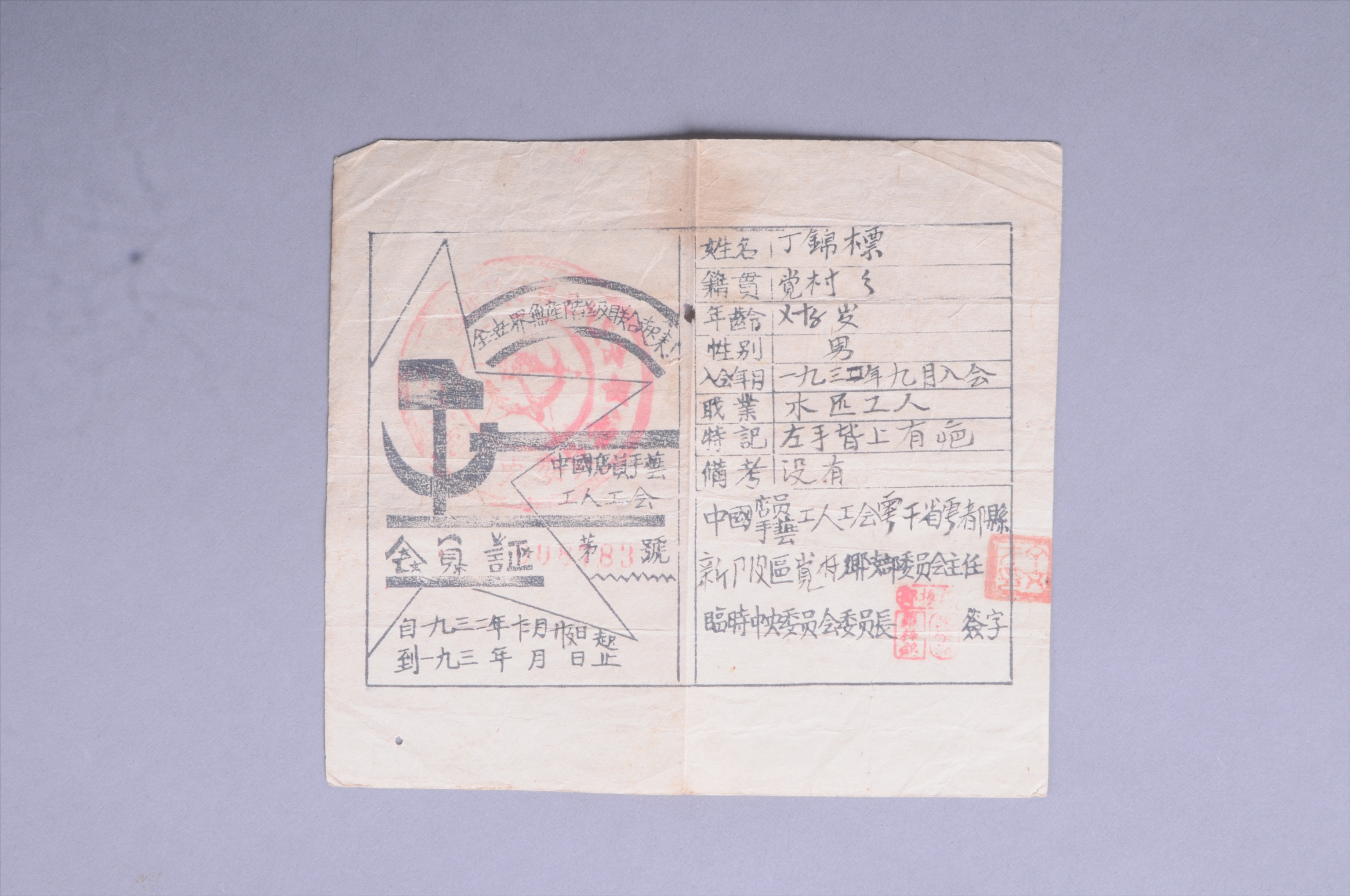 200251★1932年丁锦标的中国店员手艺工人工会会员证