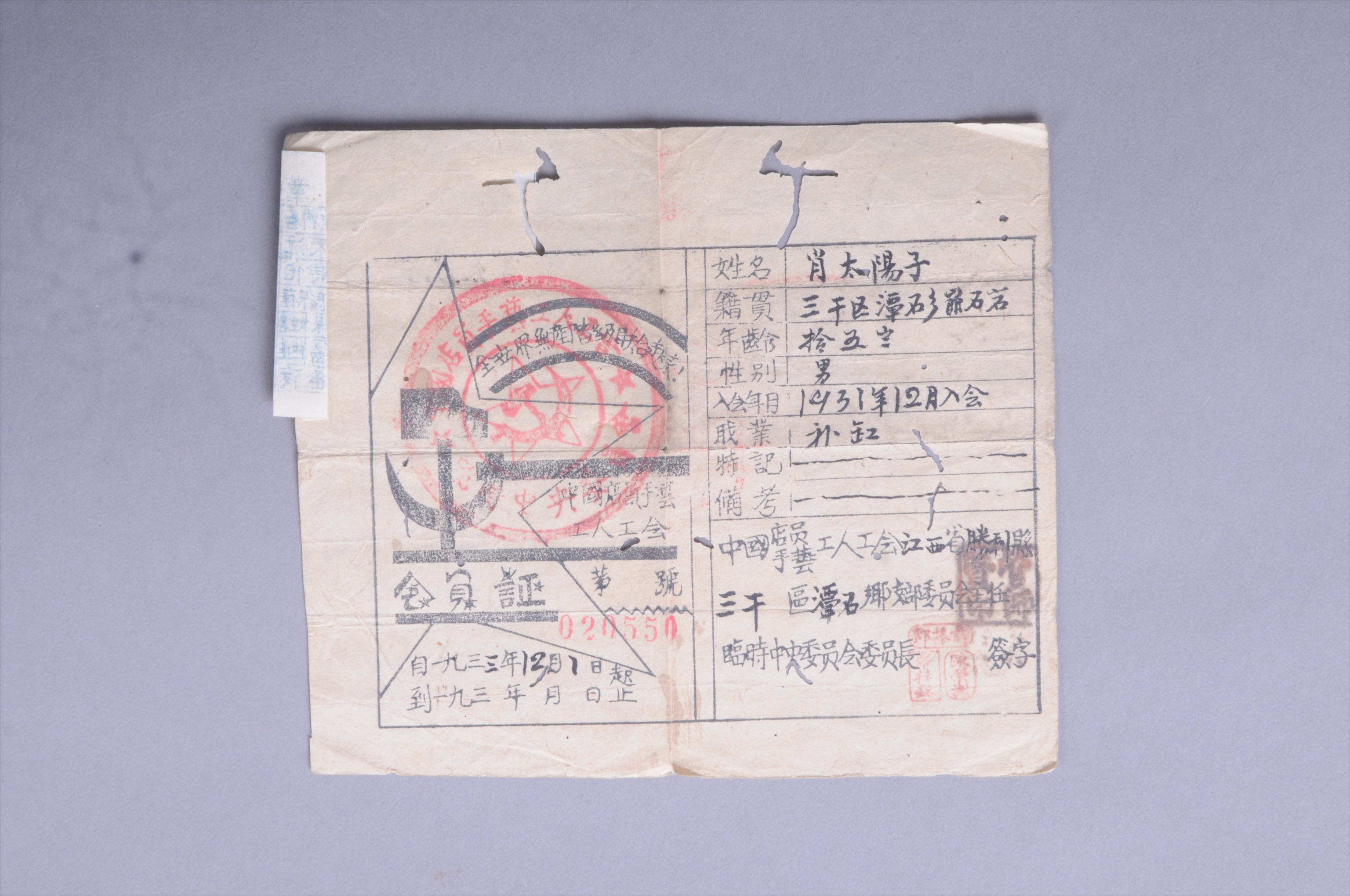 200253★1931年肖太阳子的中国店员手艺工人工会会员证