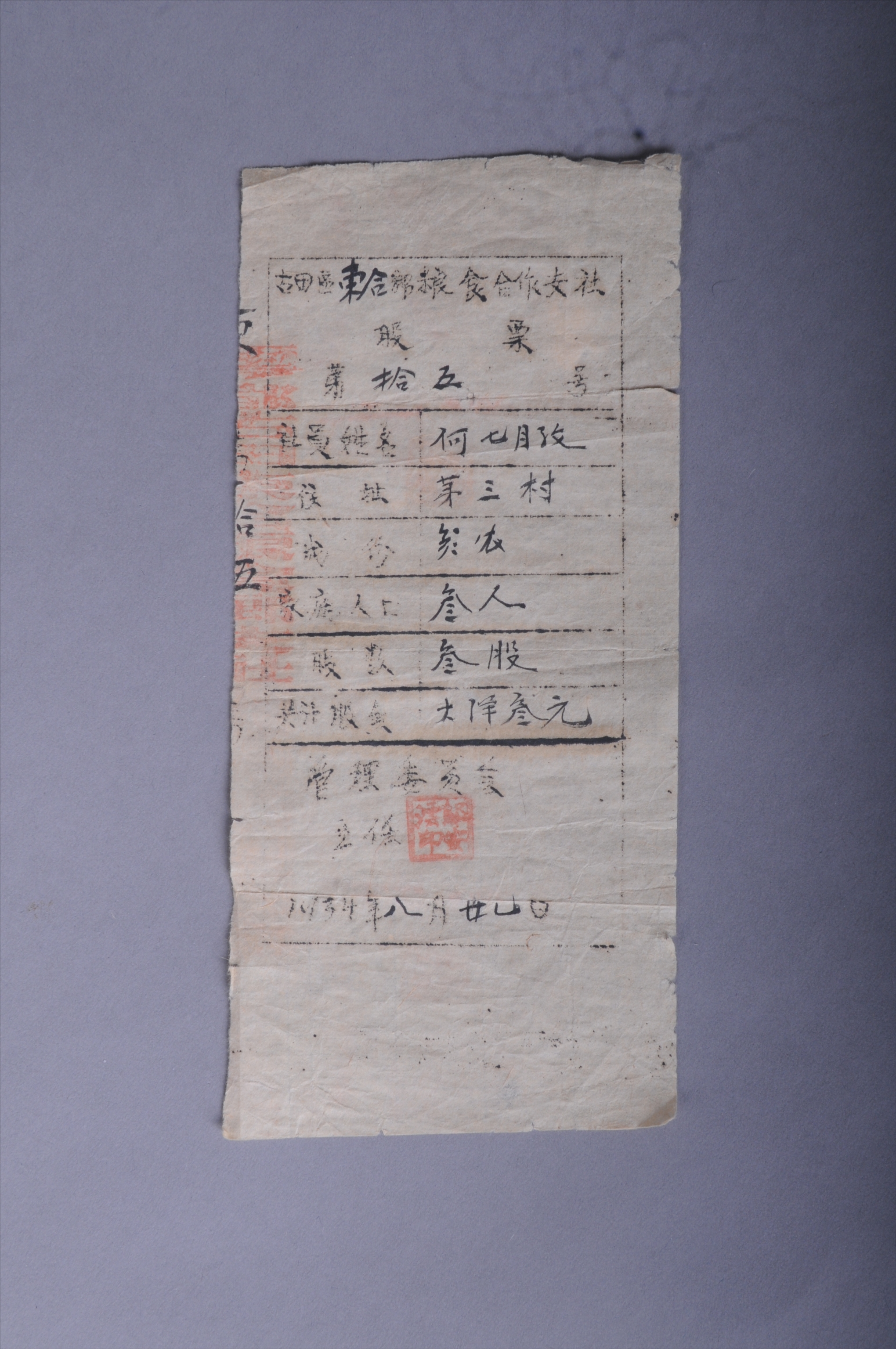 200687★1934年于都县古田区东合乡粮食合作社给何七月子的股票