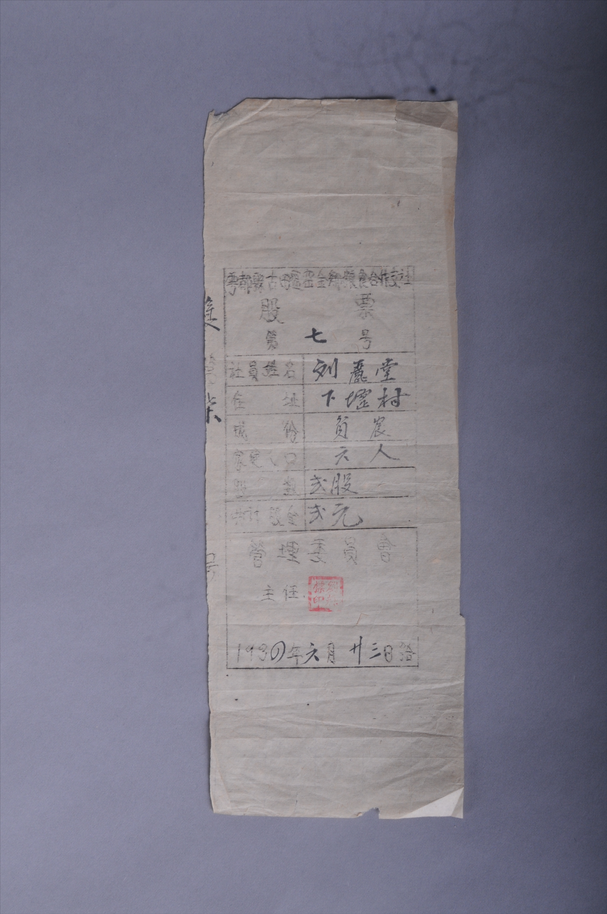 200688★1934年于都县古田区窑金乡粮食合作社给刘丽堂的股票