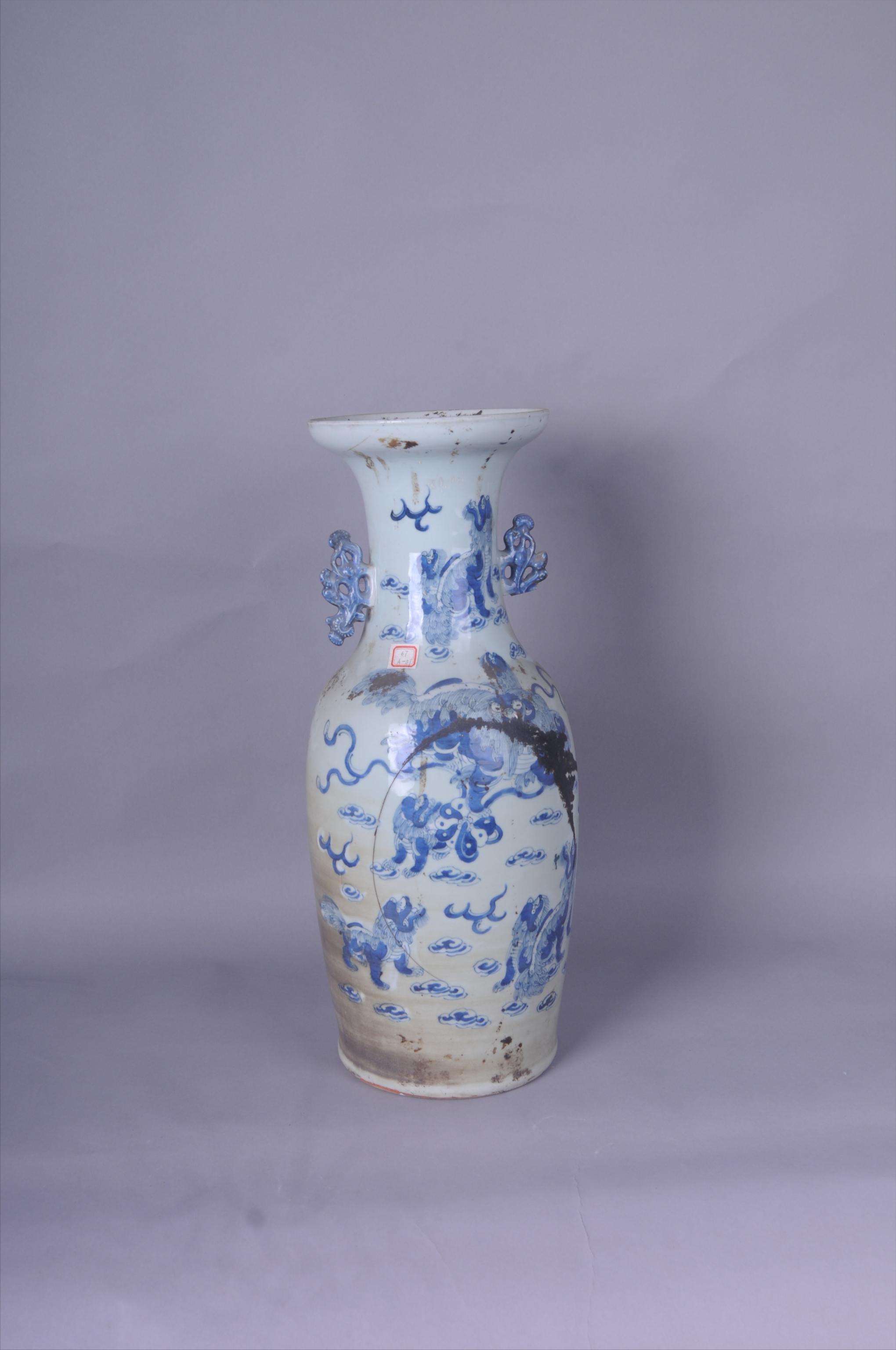 100067清青花狮子绣球双耳瓶