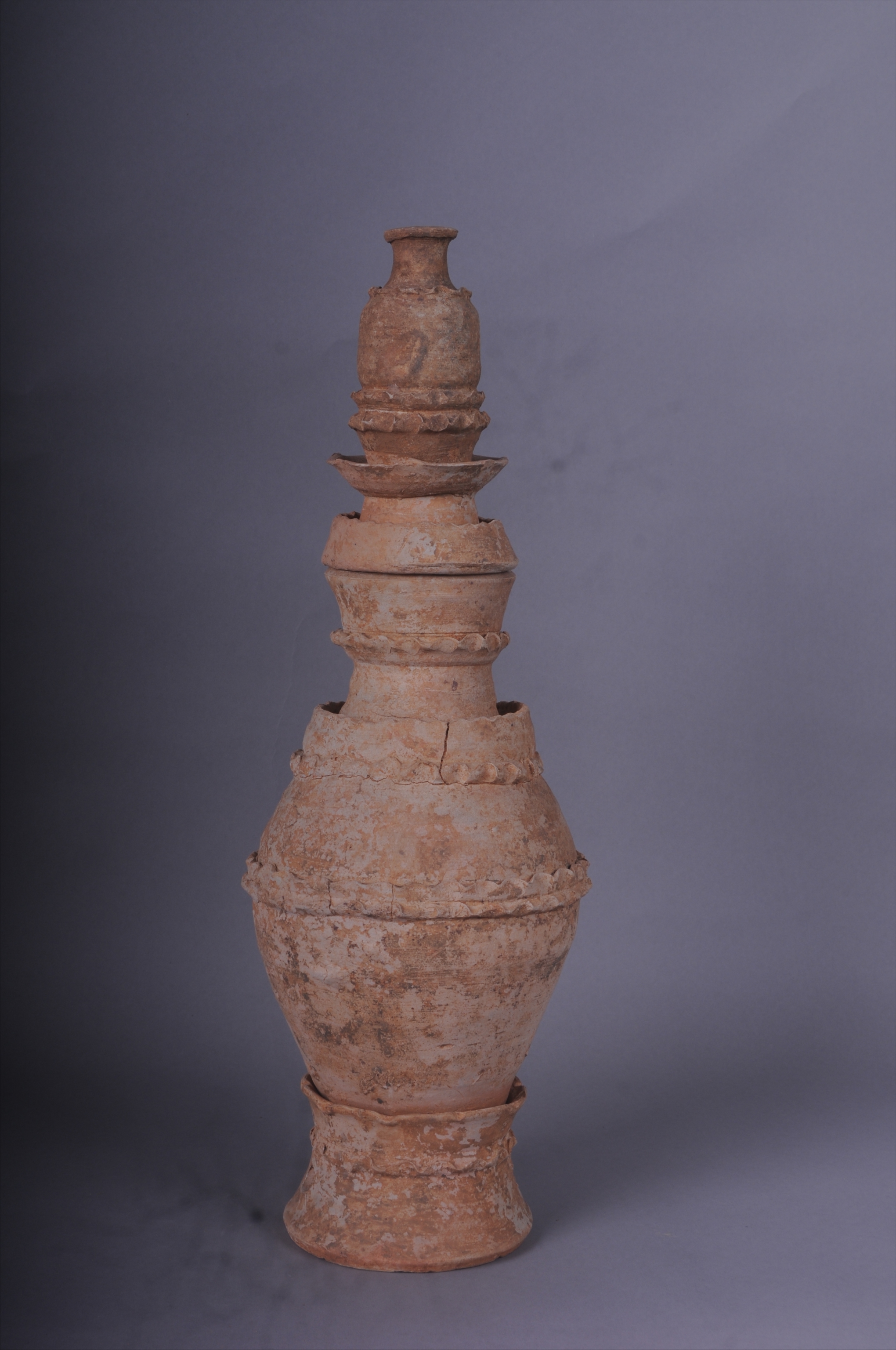 100580五代青瓷堆塑绳纹带座盖瓶