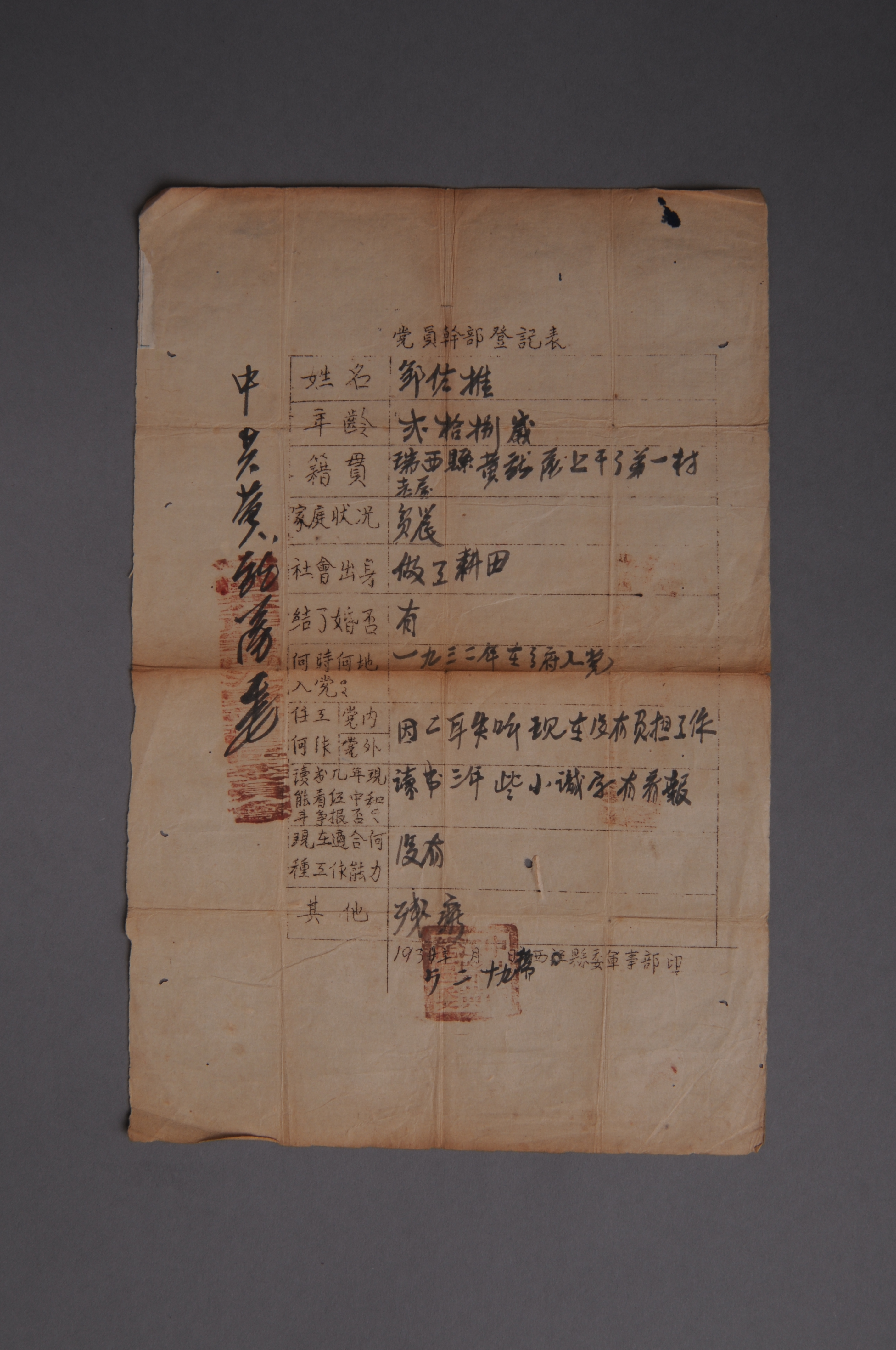 200186★1935年中共黄龙区委邹佐推的《党员干部登记表》