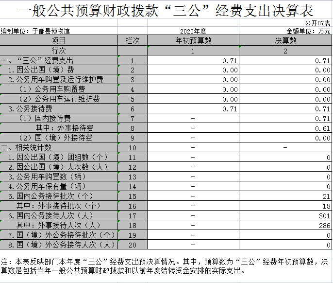 本部门2020年度一般公共预算财政拨款“三公”经费支出年初预算数为 0.71 万元,决算数为 0.71 万元,完成预算的 100 %,决算数较2019年减少1.79 万元,下降71.6 %,其中: